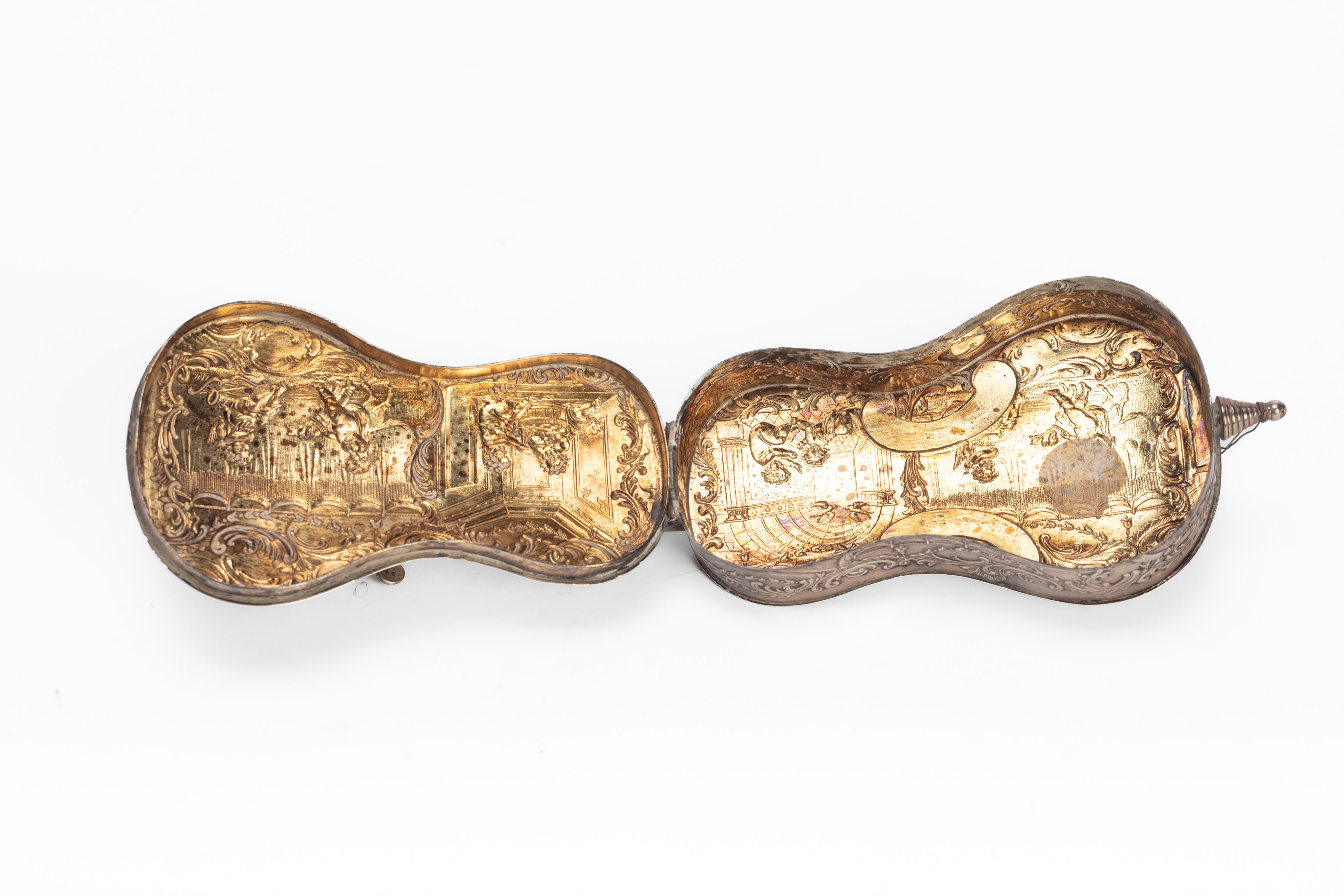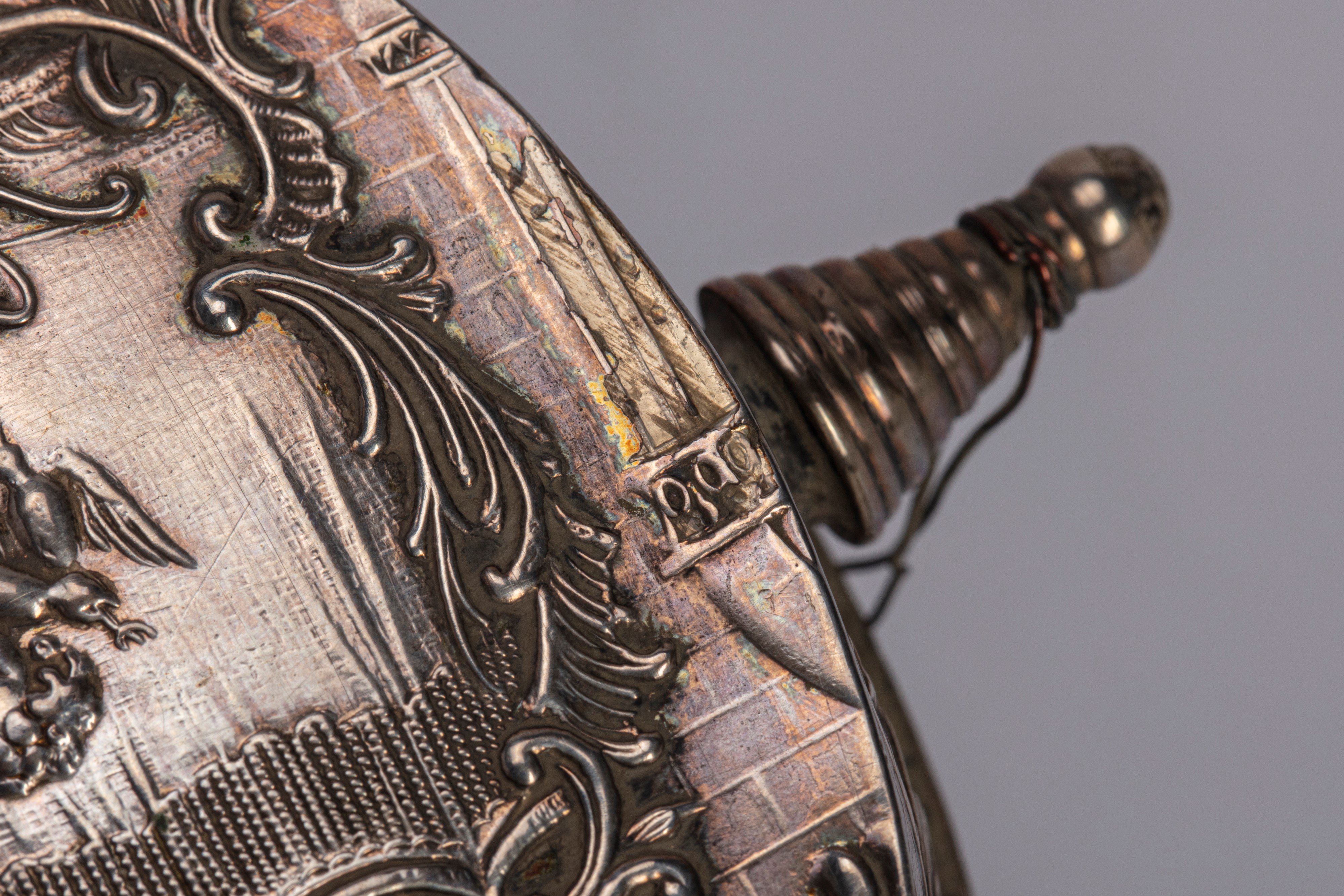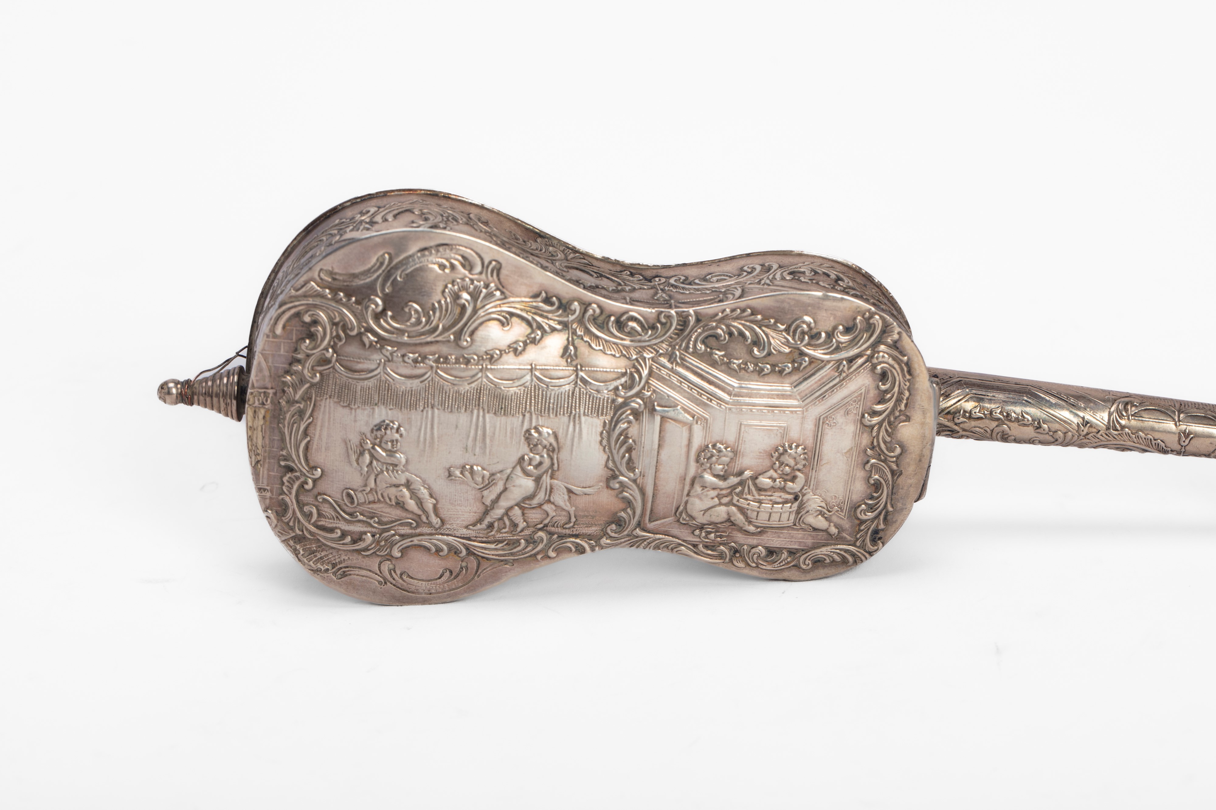 in argentocon corpo interamente sbalzato a scene di vita con putti e bordatura a volute.