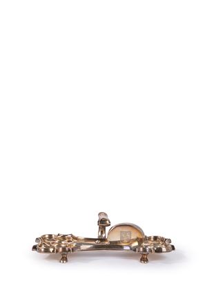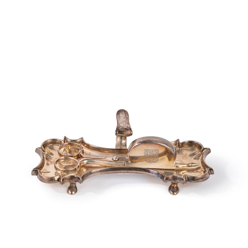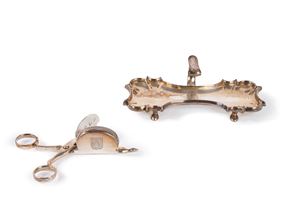con vassoietto di forma mossa sorretto da quattro piedini e presa sagomata con annessa forbice, entrambi con incisione a stemma araldico con leone.