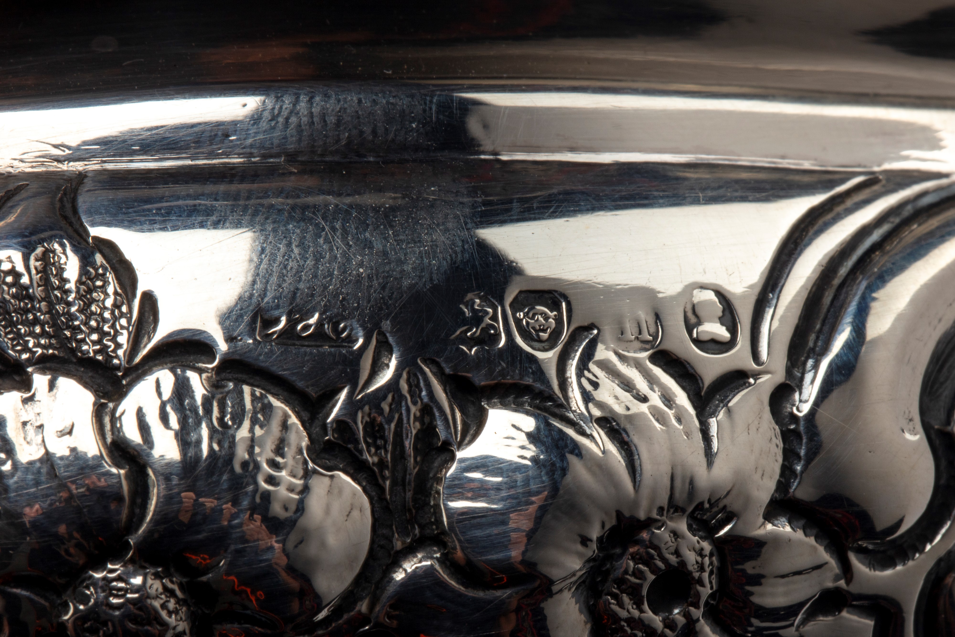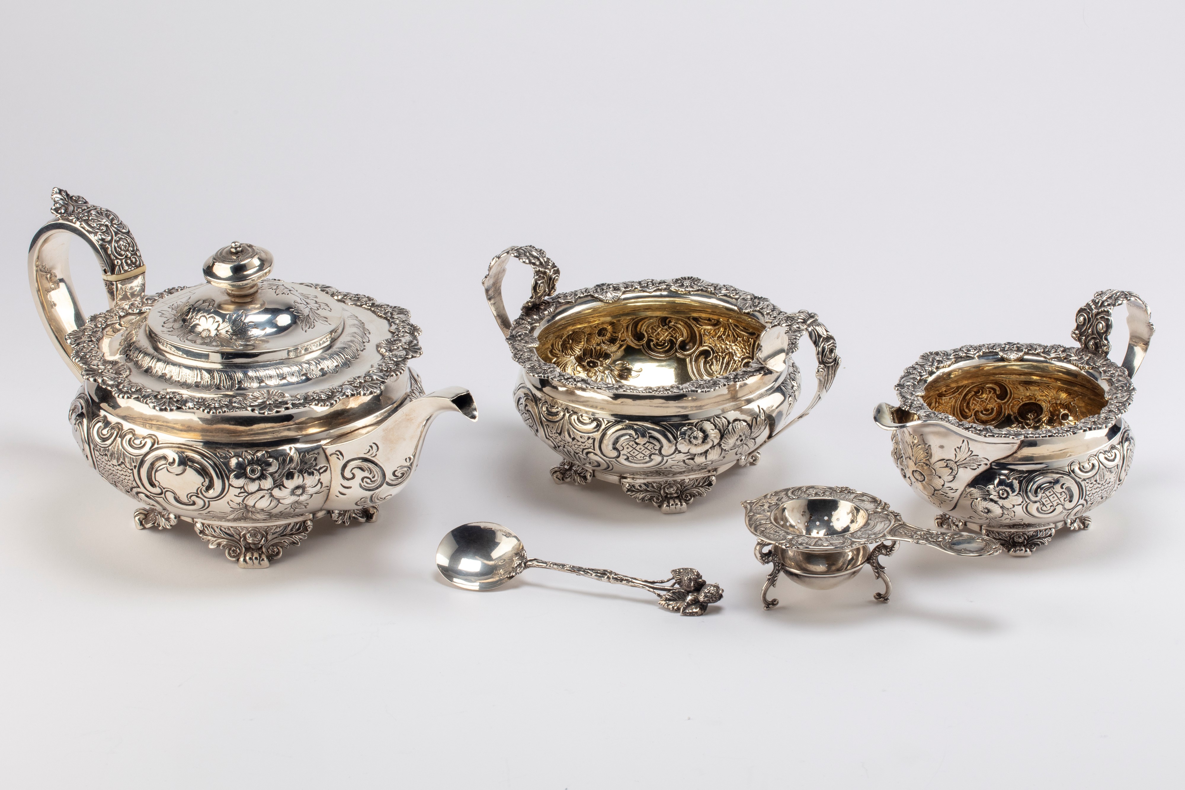in argentocomposto da teiera, zuccheriera, lattiera, colino da tè e cucchiaino, a corpo sbalzato a volute, prese torse.