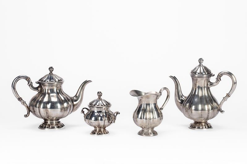 in argentocorpo decorato a grosse costolature, prese e beccucci mossi, pomoli dei coperchi con presa cesellata a frutto a tutto tondo.