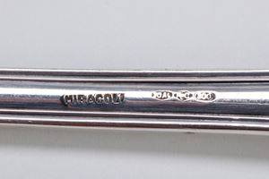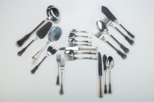 12 cucchiaini da caffè, 12 forchette da insalata, 12 forchette da dolce, 12 cucchiai da dolce, 12 cucchiai, 12 cucchiaini da tè, 12 forchette da pesce, 12 forchette, 12 coltelli da pesce, 12 coltelli, 12 coltelli da frutta, 10 palette da dolce, 1 cucchiaio da portata, 1 forchetta da portata, 1 mestolo, 1 forchetta da arrosto, 1 coltello da servizio pesce, 1 forchetta da servizio pesce, 2 palette da dolce.