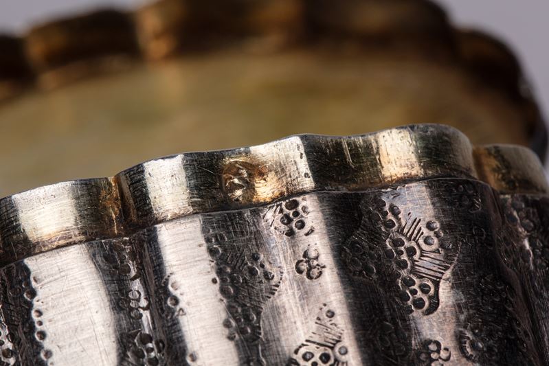 in argentodi forma ovoidale sagomata con coperchio inciso a motivi romboidali stilizzati.