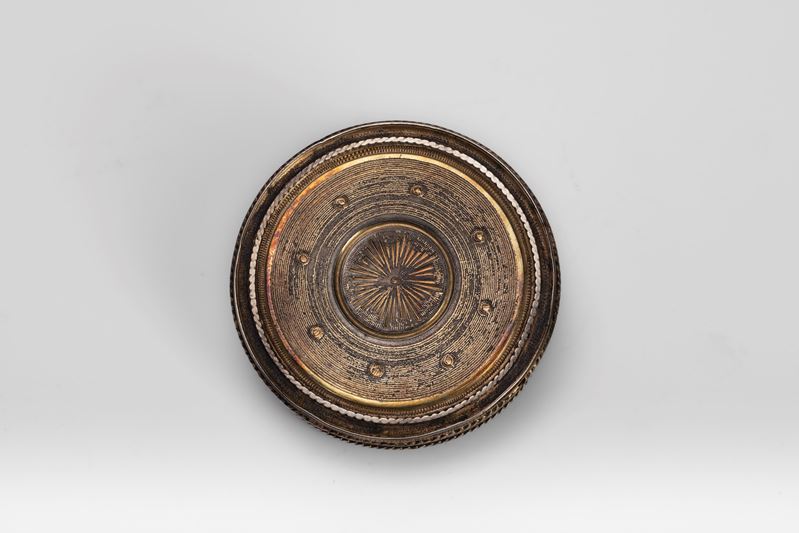 di forma circolare con coperchio decorato al centro da motivo floreale e sulla fascia da motivo concentrico circolare.