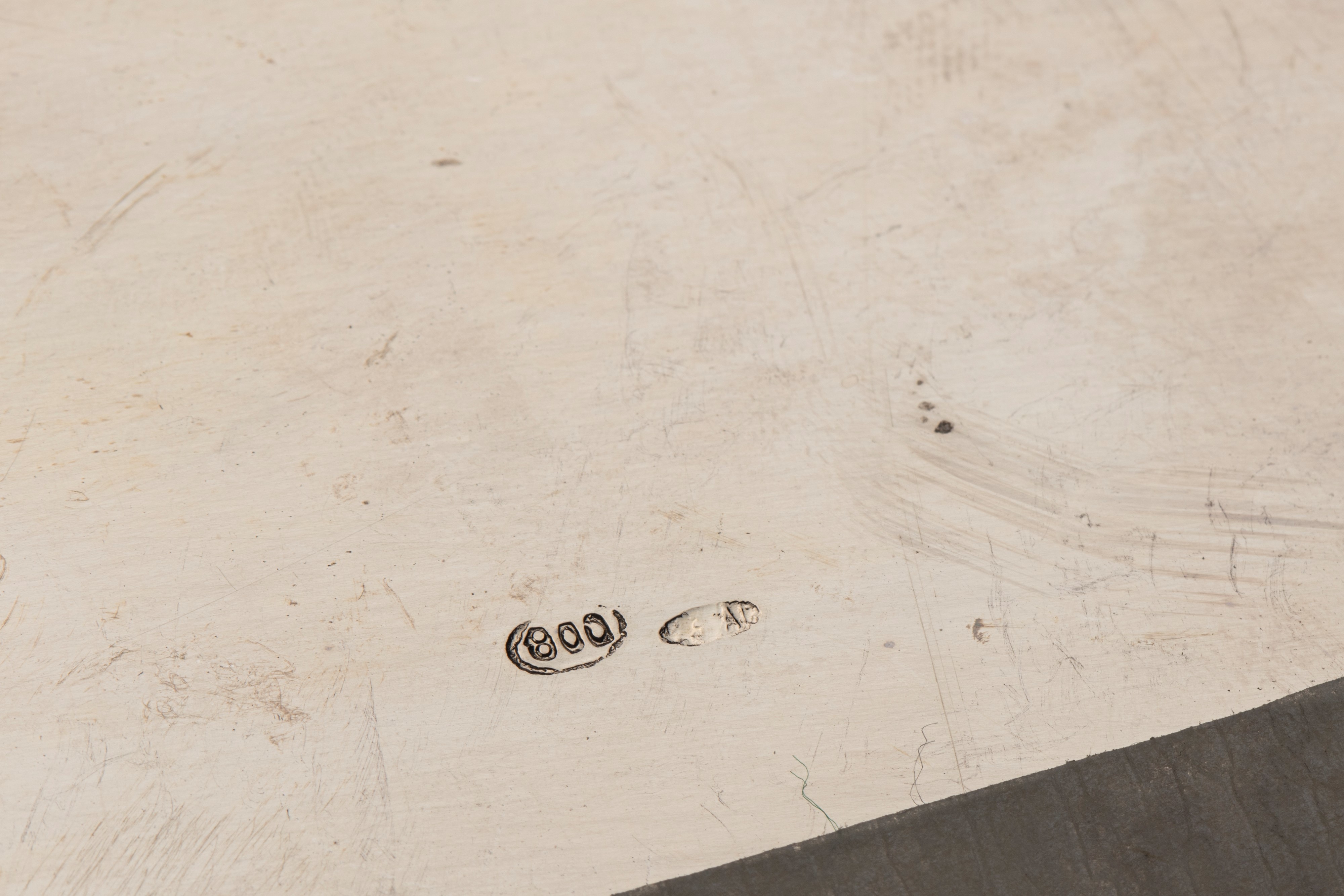 in argentocorpo decorato da incisione a festone floreale, coperchio sbalzato con presa e manico in legno.