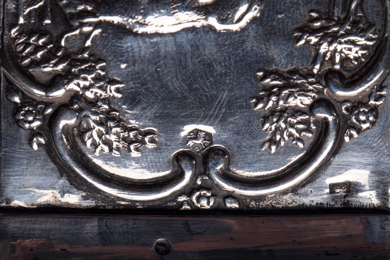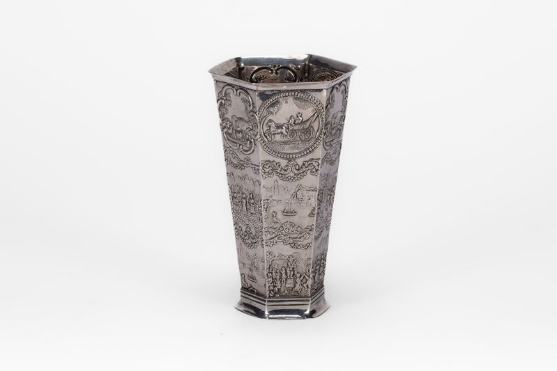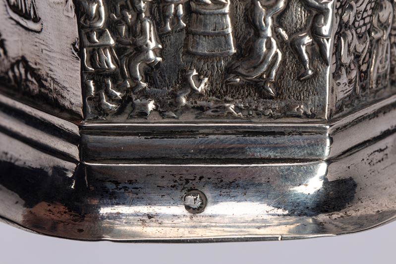 in argentoa corpo esagonale rastremato, decorato con varie scene olandesi raffiguranti mucche, carrozze, architetture olandesi, figure in abiti tradizionali che danzano ad una fiera, scene di navigazione, punzoni sul bordo superiore e alla base.