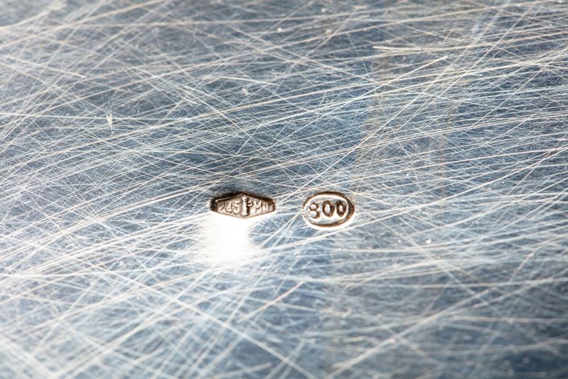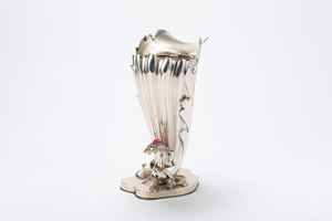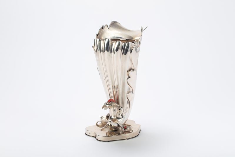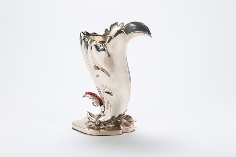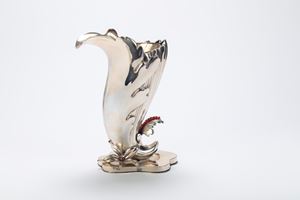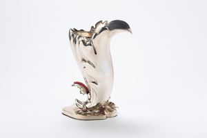 sbalzato e mosso, con decoro a fondale marino e applicazioni in corallo rosso, bicchiere interno estraibile.