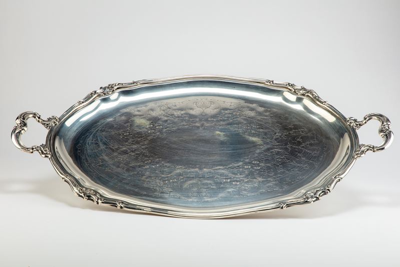a due manici a volute con decoro a rilievo in stile Rococò, con bordo sagomato, parte centrale decorata da motivo floreale inciso.