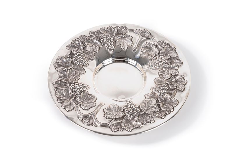 riccamente sbalzato a tralci di vite e uva.