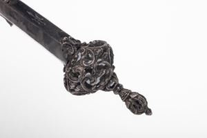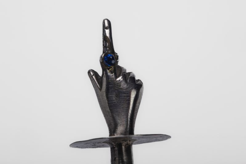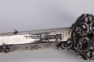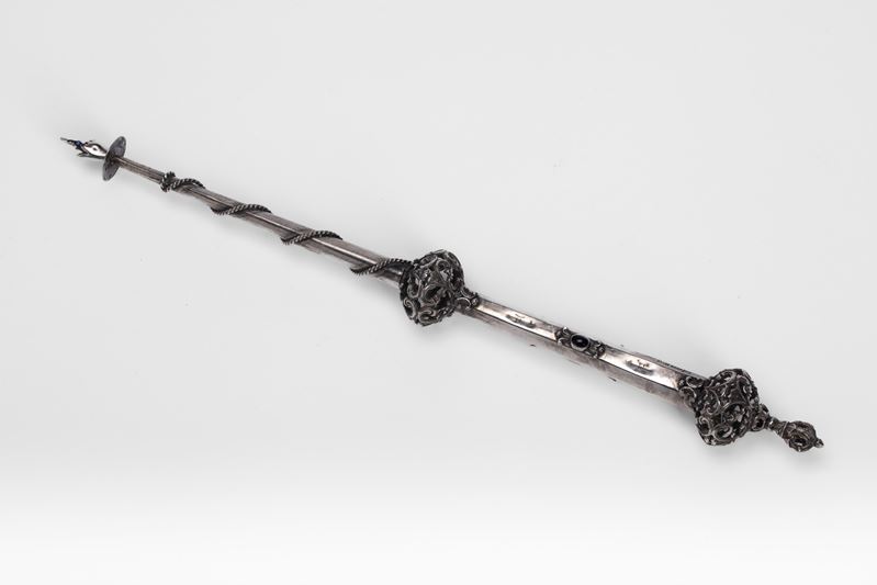 in argentoa corpo sfaccettato. Puntale con piccola mano stilizzata decorata con anellino in pietra dura, al centro e sul terminale motivo decorativo sferico traforato.