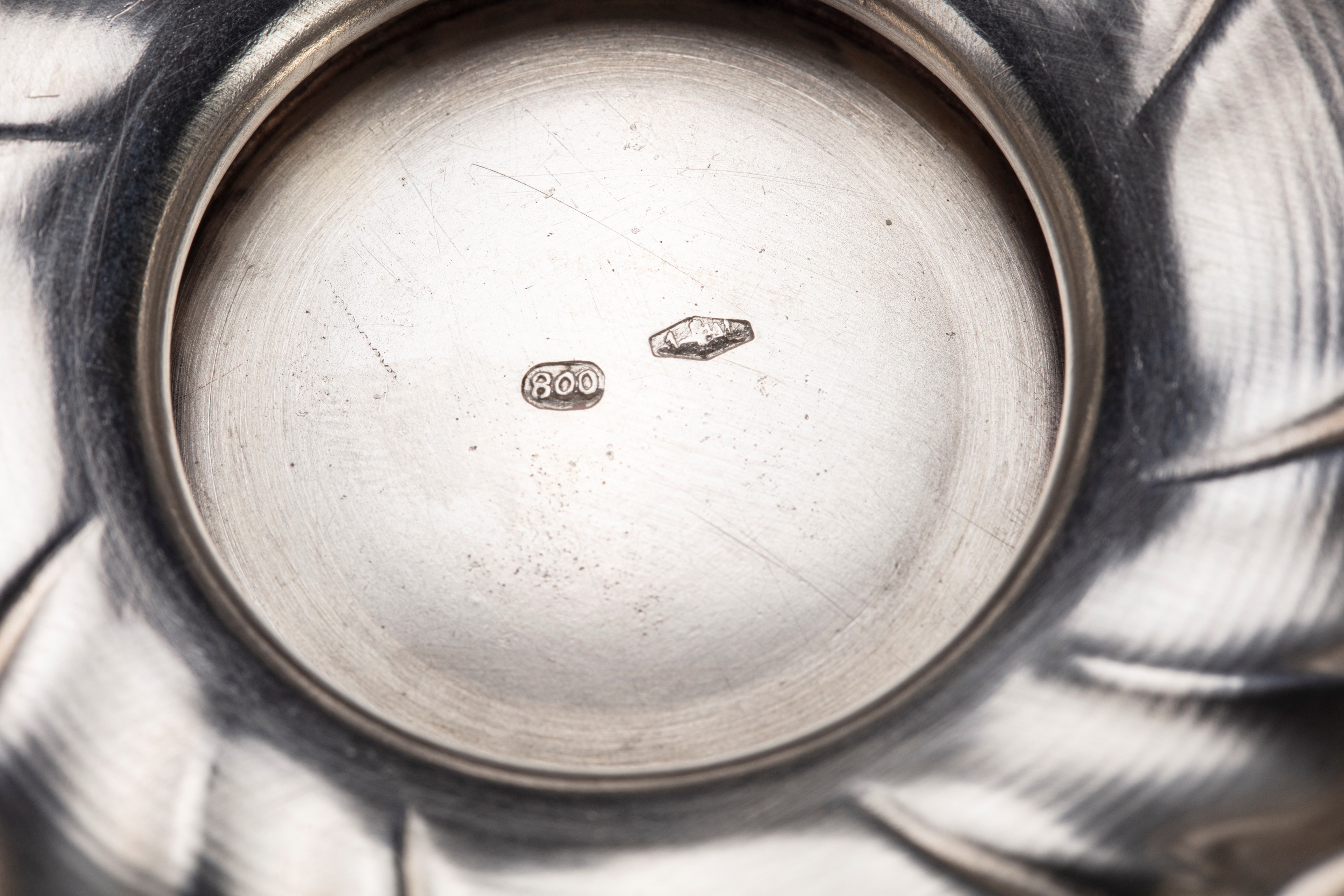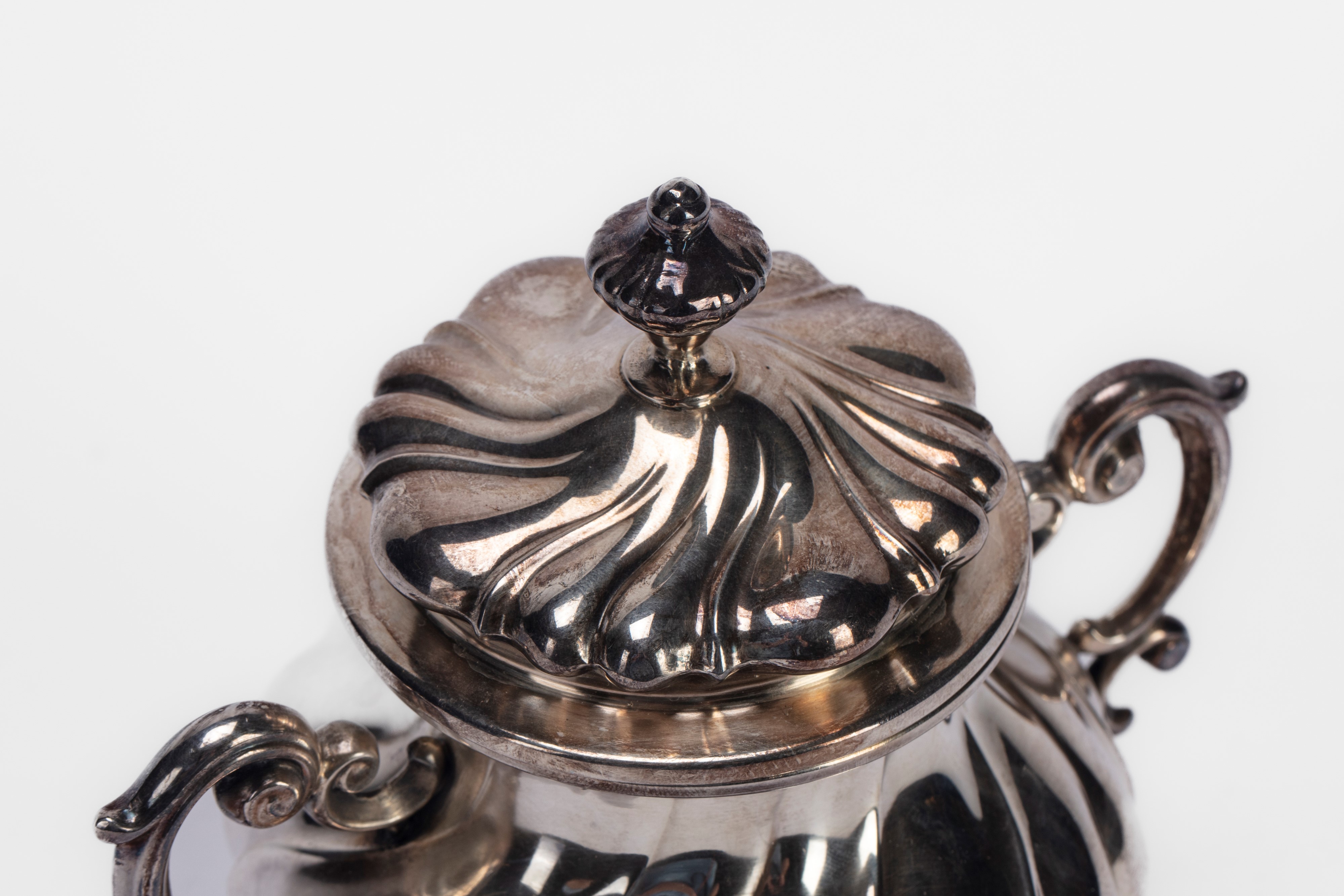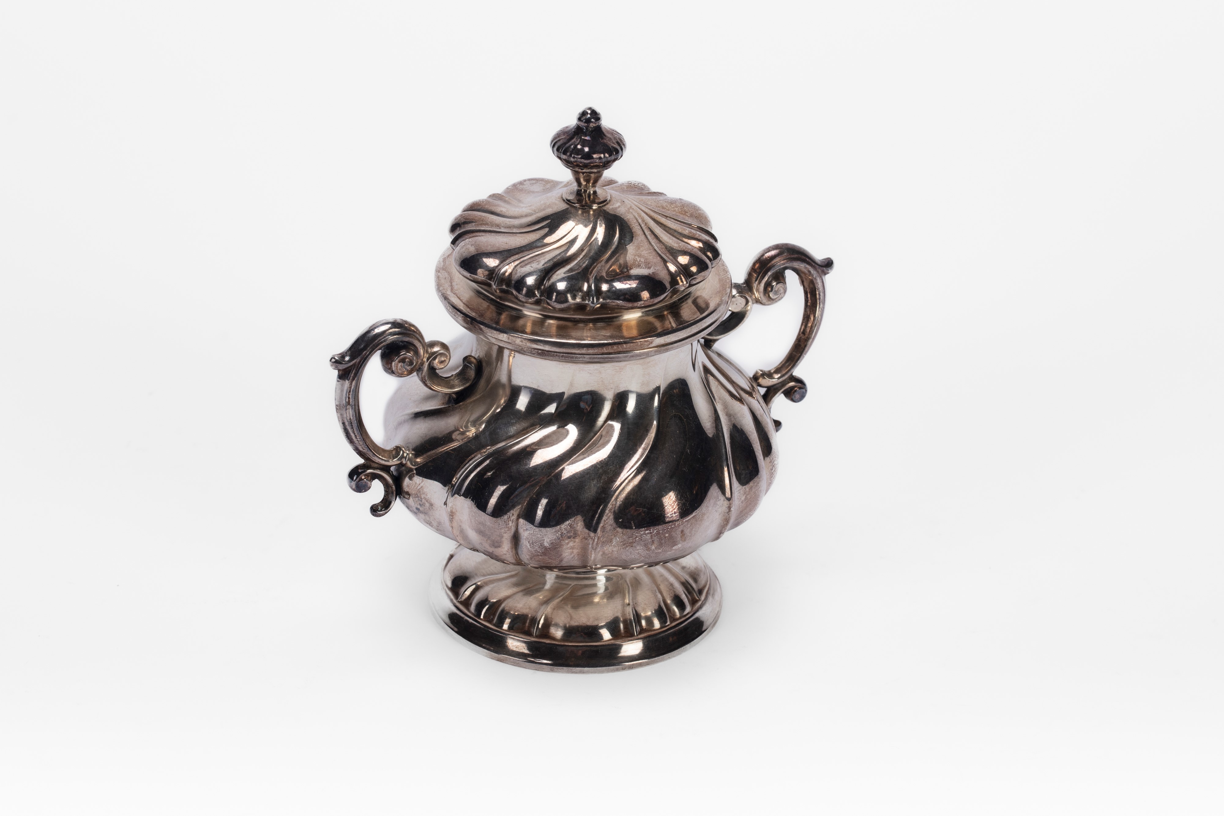 in argentocon due anse laterali, corpo e coperchio sbalzati a costolatura.
