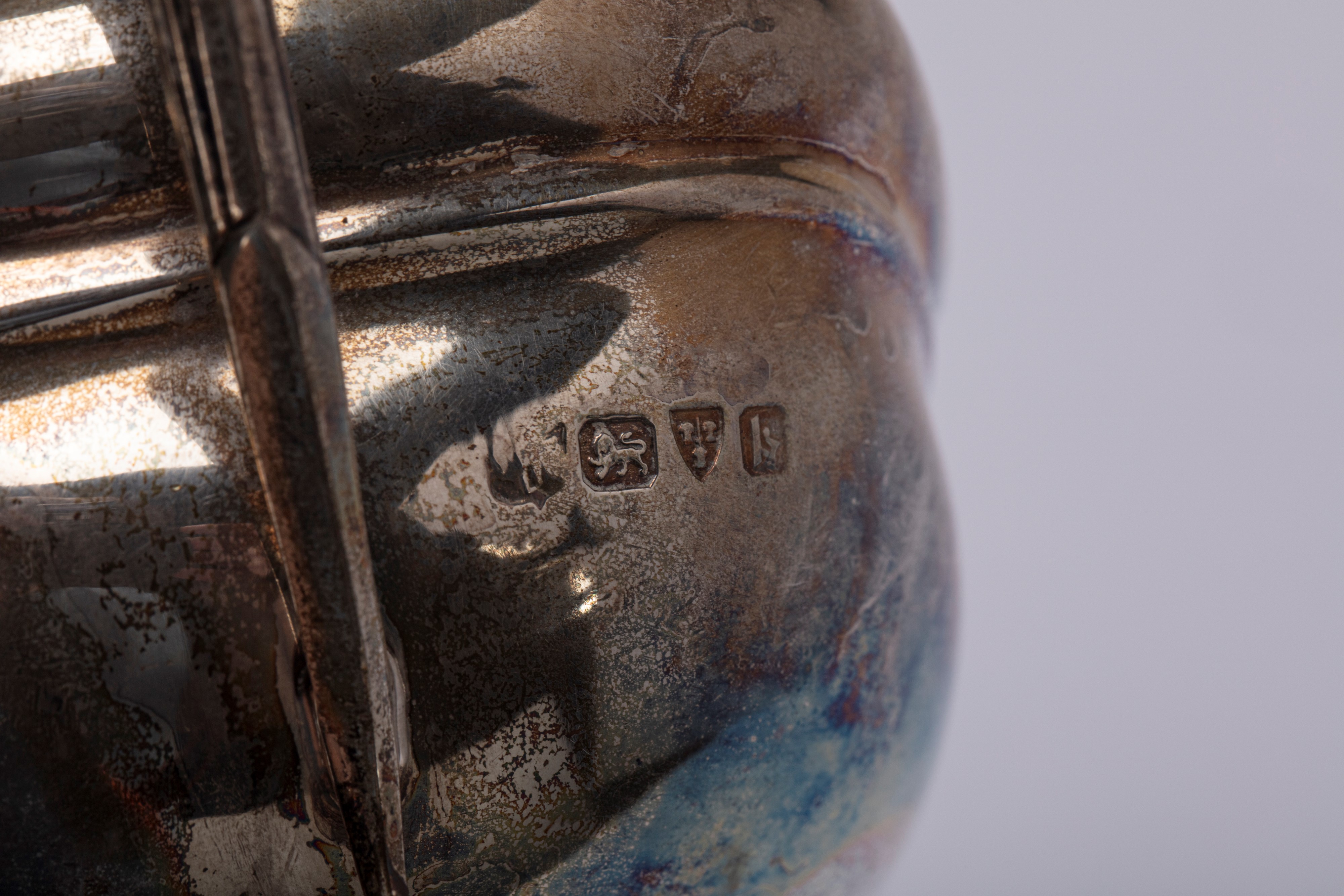 in argentodi forma rettangolare a corpo bombato con prese laterali geometriche e piedini sferici.