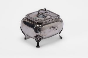 di forma rettangolare con superfici bombate e lisce, montanti decorati a piccoli sbalzi geometrici, piedini mossi, presa del coperchio sagomata. (Difetti).