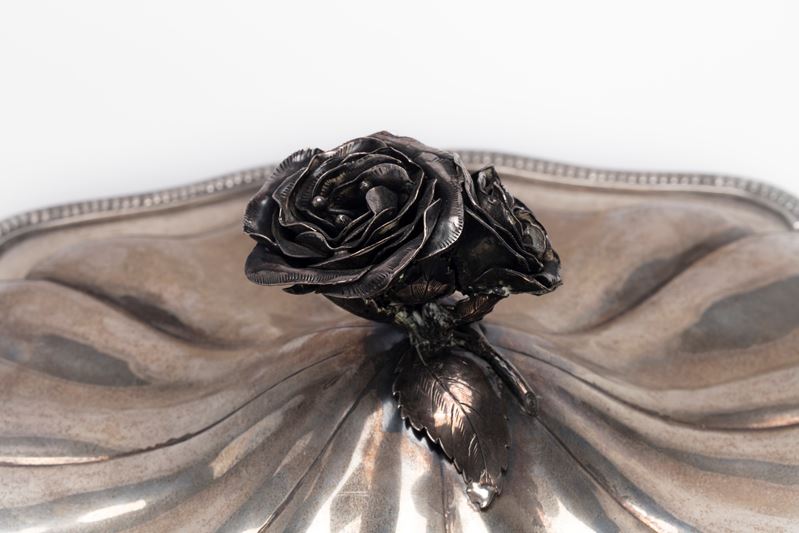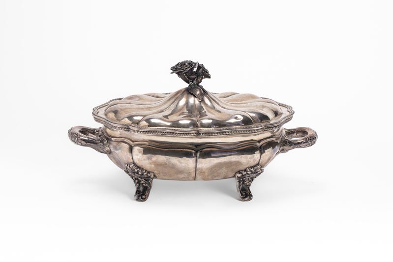 di forma mossa con presa a fiori a tutto tondo, bordure cordonate, anse e piedini cesellati a volute.