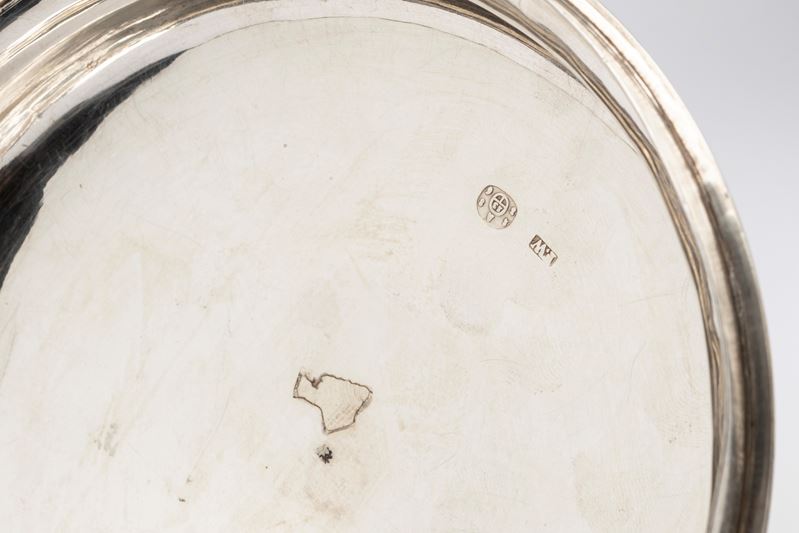in argentodi forma cilindrica, prese ad anello, decorato a rilievo, con stoppiniera non pertinente in argento sterling 925 con manico in legno.