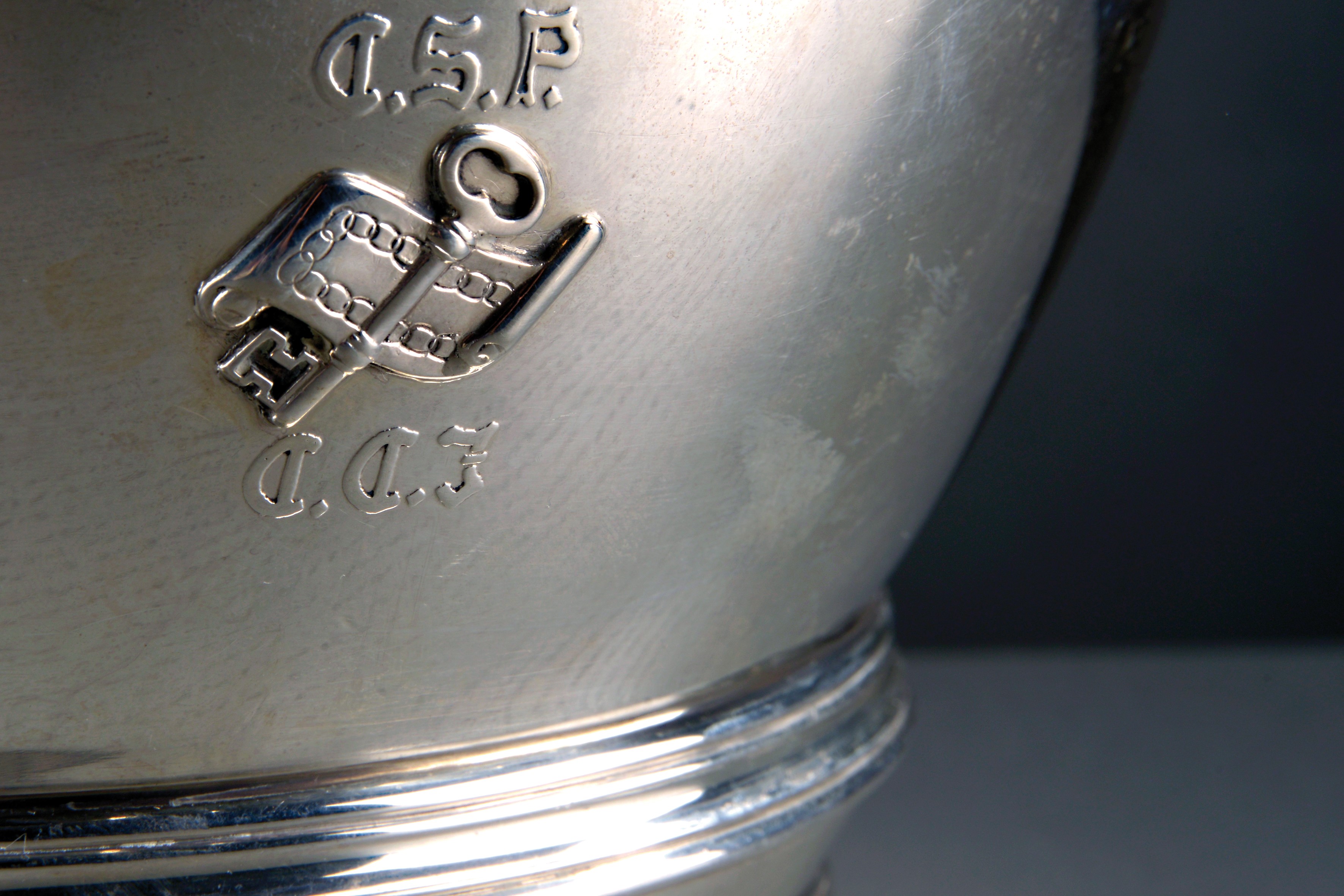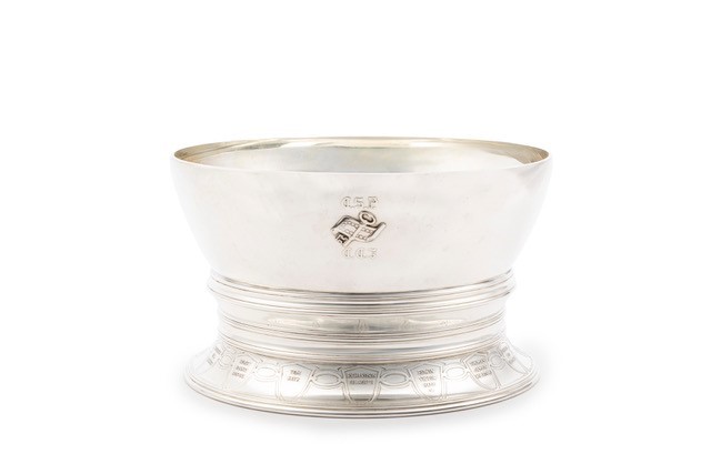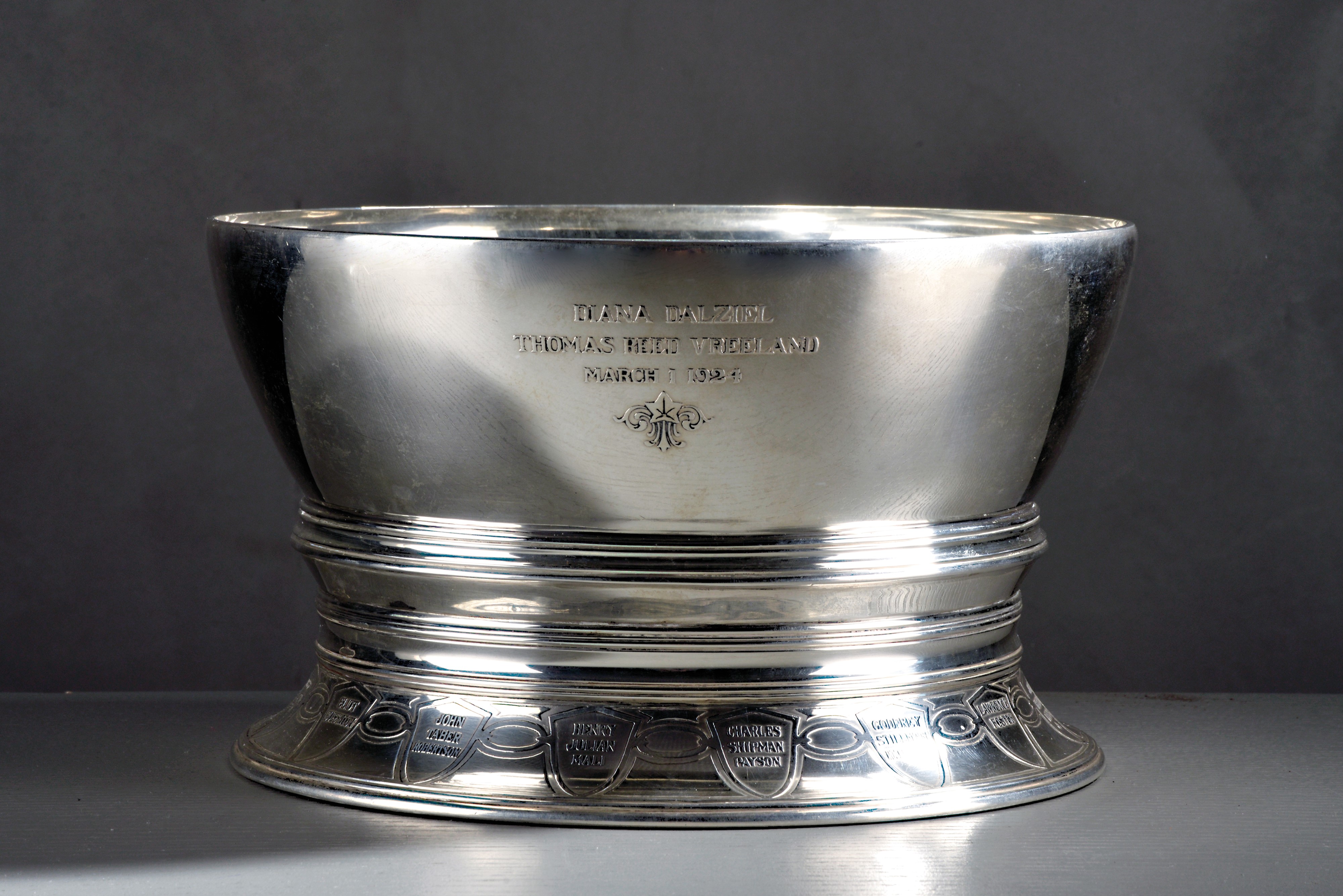 Intorno alla base della coppa vi sono quindici crest incisi ad altorilievo, con i nomi dei membri dell’associazione: Henry Julian Mali, Charles Shipman Payson, Godfrey Stillman Rockefeller, Lawrence Foster, John Herndon French Jr., Kenneth Hill Hawkes, Sidney Barnes Hosmer, Tom Keck, Richardson Dilworth, Edwin Victor Hale Jr., Thomas James Robertson, Thomas Reed Vreeland, Robert Carson 3rd, Eliot Buffinton, John Taber Robertson. Firmata e punzonata Tiffany & Co. 18457 Maker 2927, sterling silver 925/1000, M 3727.