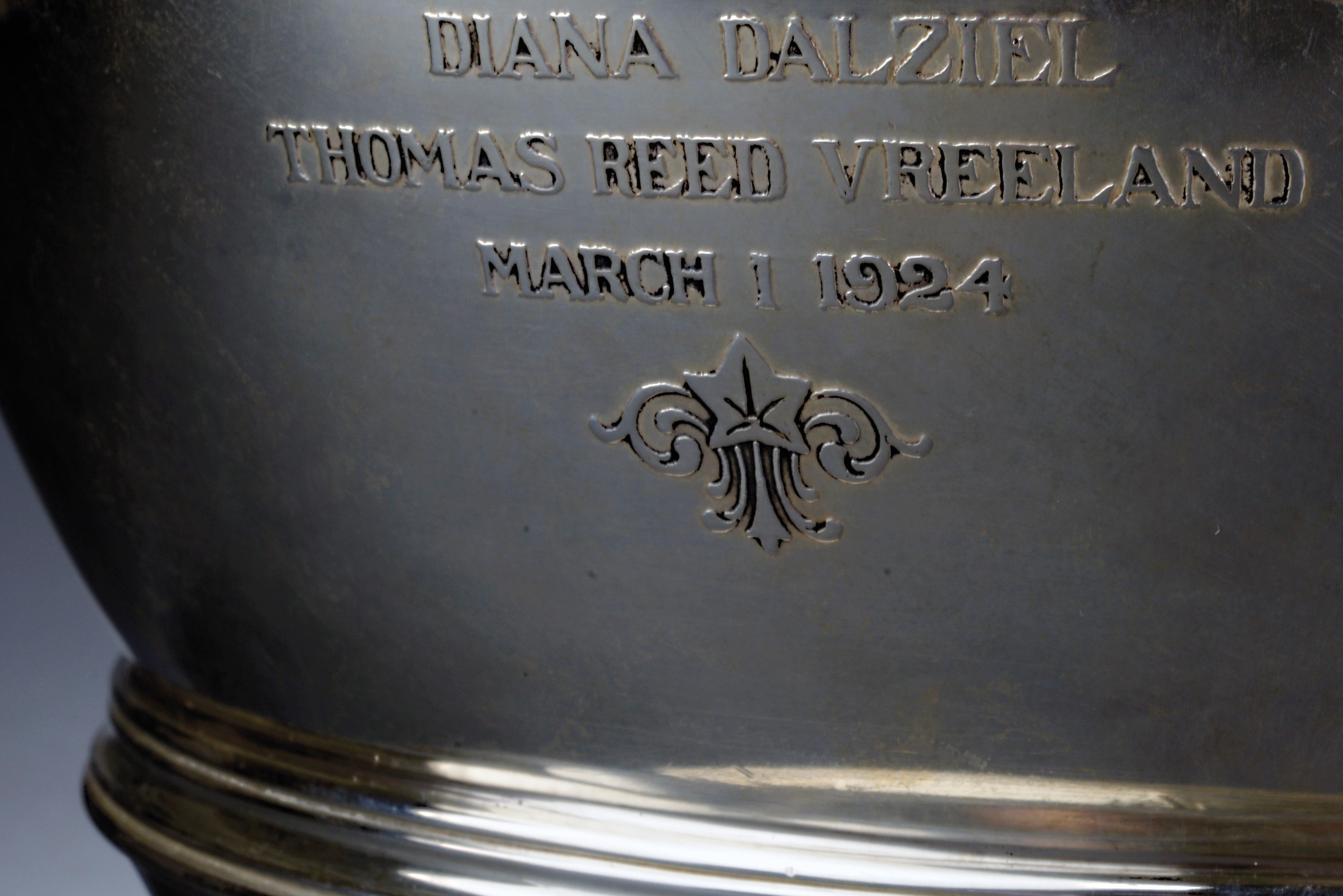 Reca da un lato, con tecnica ad incisione e a riporto ad altorilievo, i nomi degli sposi e la data del matrimonio:“DIANA DALZIEL - THOMAS REED VREELAND - MARCH 1 1924”, e al retro, il simbolo “Scroll & Key” (pergamena e chiave) con le iniziali C.S.P - CCJ, della Scroll and Key Secret Society dell’Università di Yale; la “Keys” era la più “letteraria" delle associazioni interne, nel senso di società segrete, di Yale.