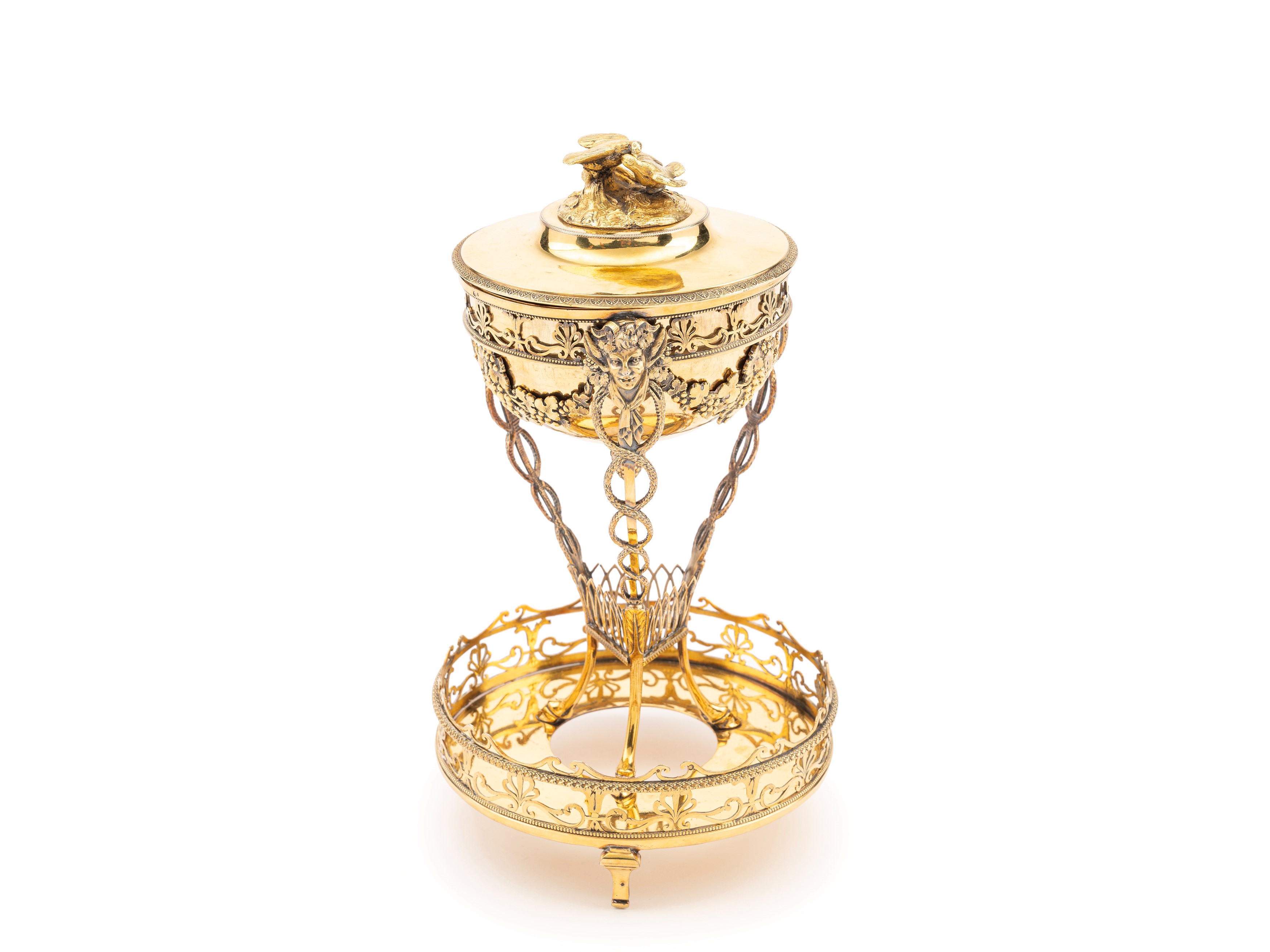 base circolare con ghiera traforata a volute, sostegno tripode terminante a zoccolo in forma di serpenti avviluppati sormontati da teste di satiri intervallate da ghirlande a tralci d'uva, coppa estraibile con terminale a pigna, presa del coperchio a coppia di colombe a tutto tondo.