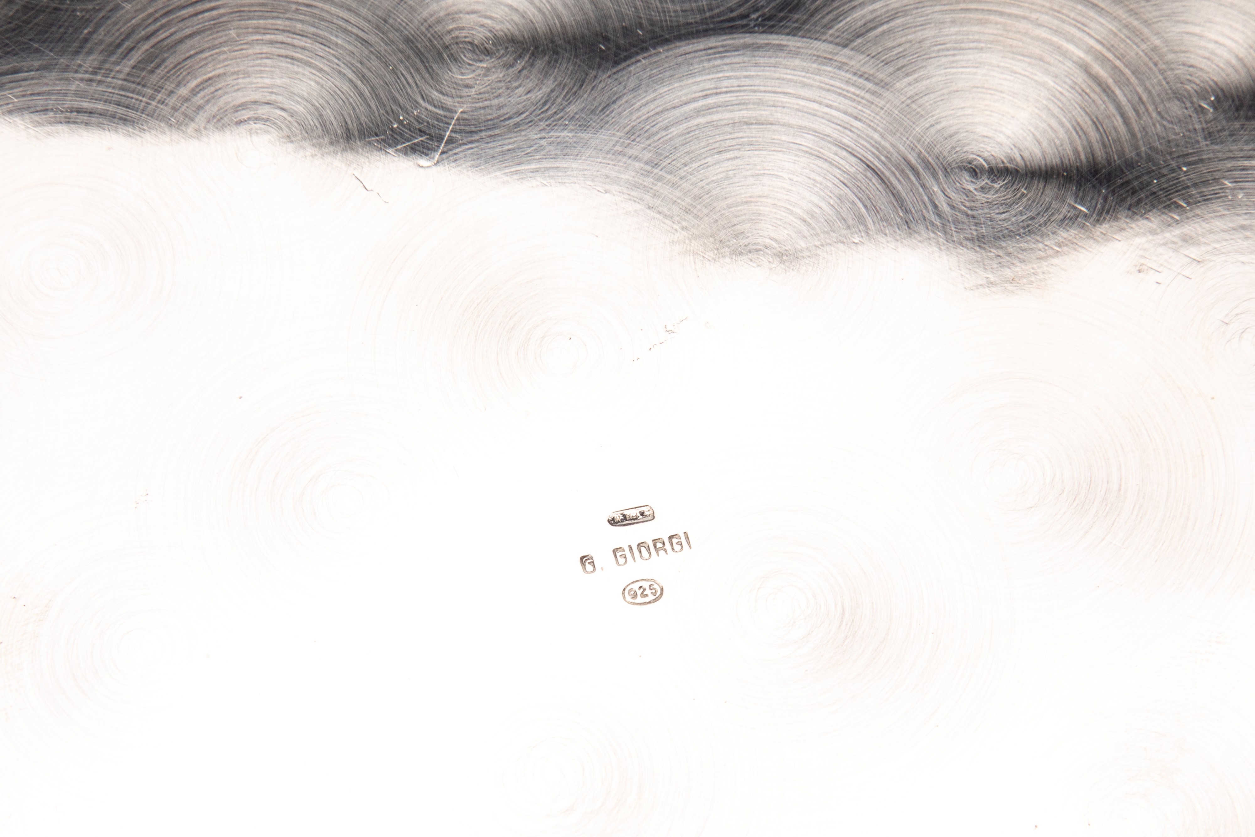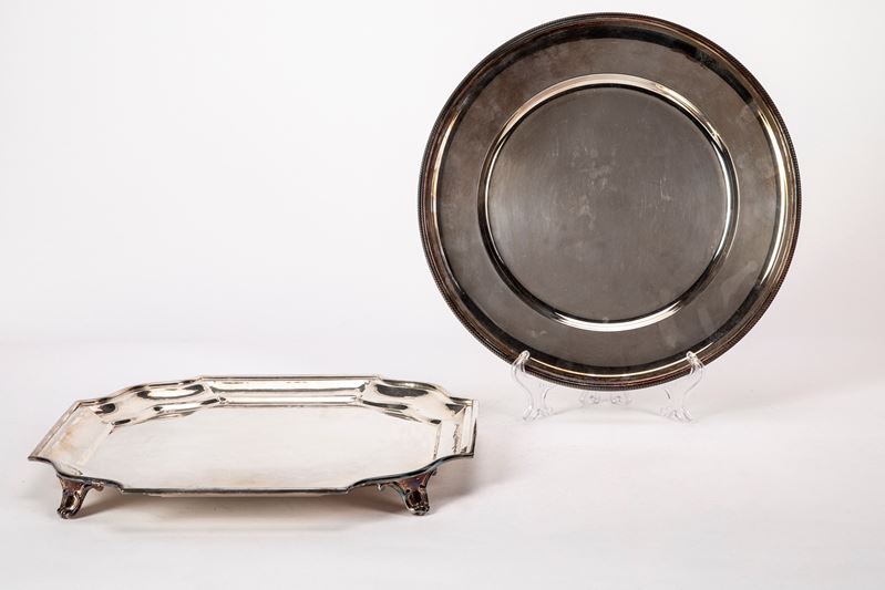 in argento 800 e 925piatto di forma circolare con cavetto e bordo liscio, alzatina a bordo sagomato sorretta da piedi a ricciolo.
