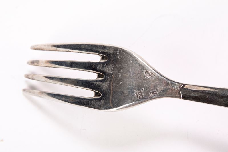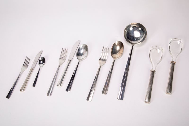 in argentocon manico affusolato con decoro geometrico stilizzato leggermente in rilievo. Composto da un mestolo, due posate da servizio, 12 cucchiaini, 12 forchette, 12 forchettine da frutta, 12 coltelli, 12 coltelli da frutta e 12 cucchiai.