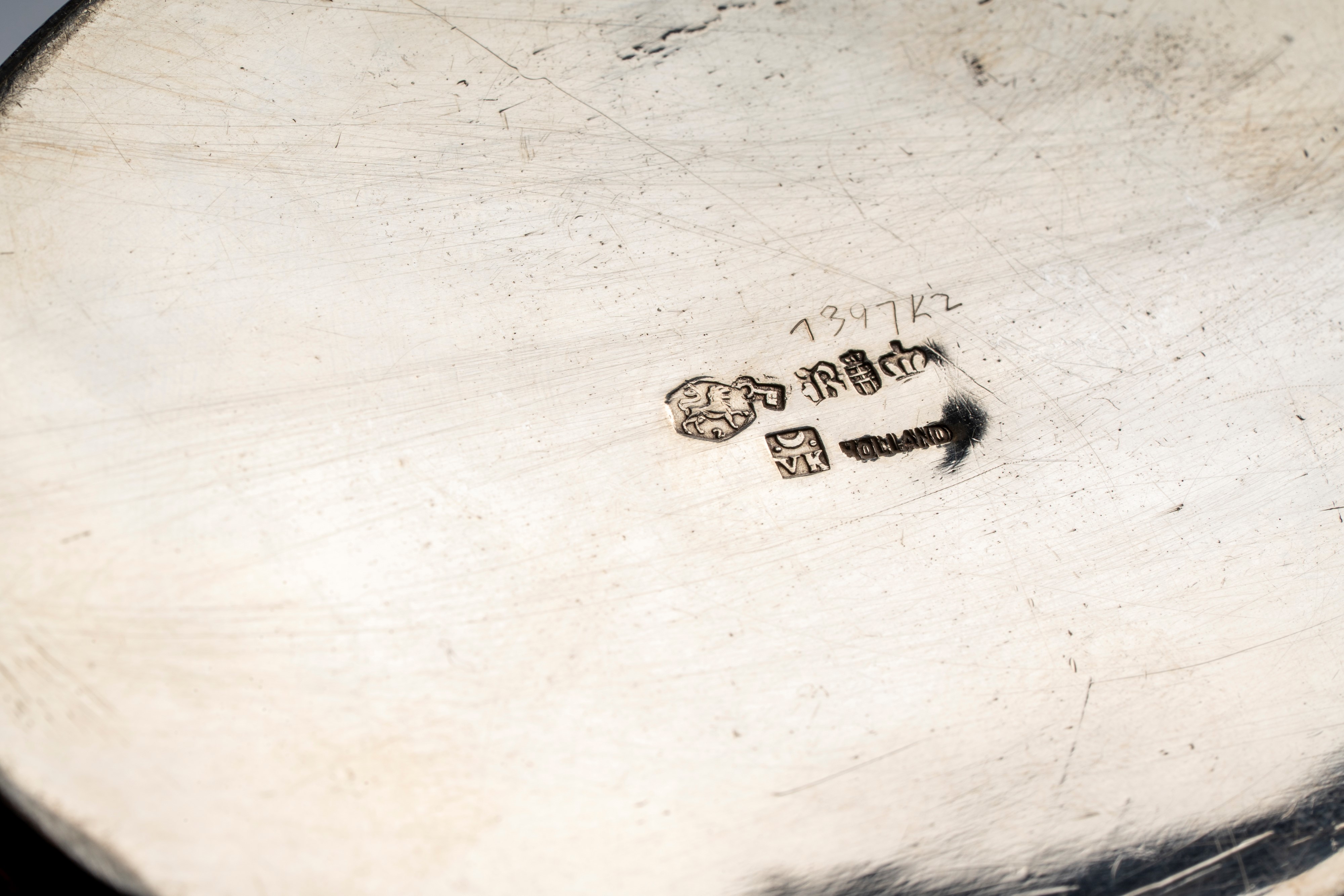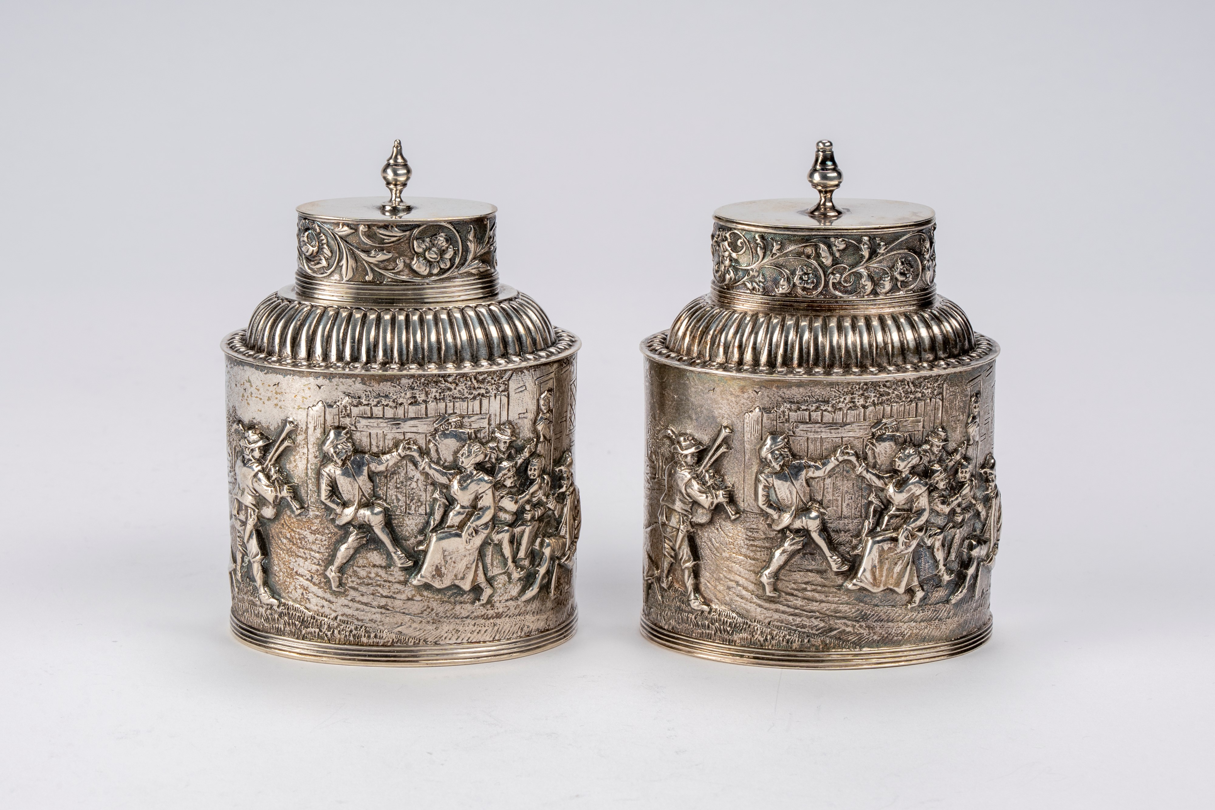 in argentoa corpo ovoidale, parte superiore con coperchio e bordo sbalzato e scanalato, corpo interamente sbalzato con scene di vita popolari con figure danzanti e scena d’interno.