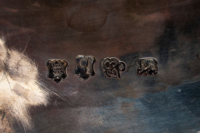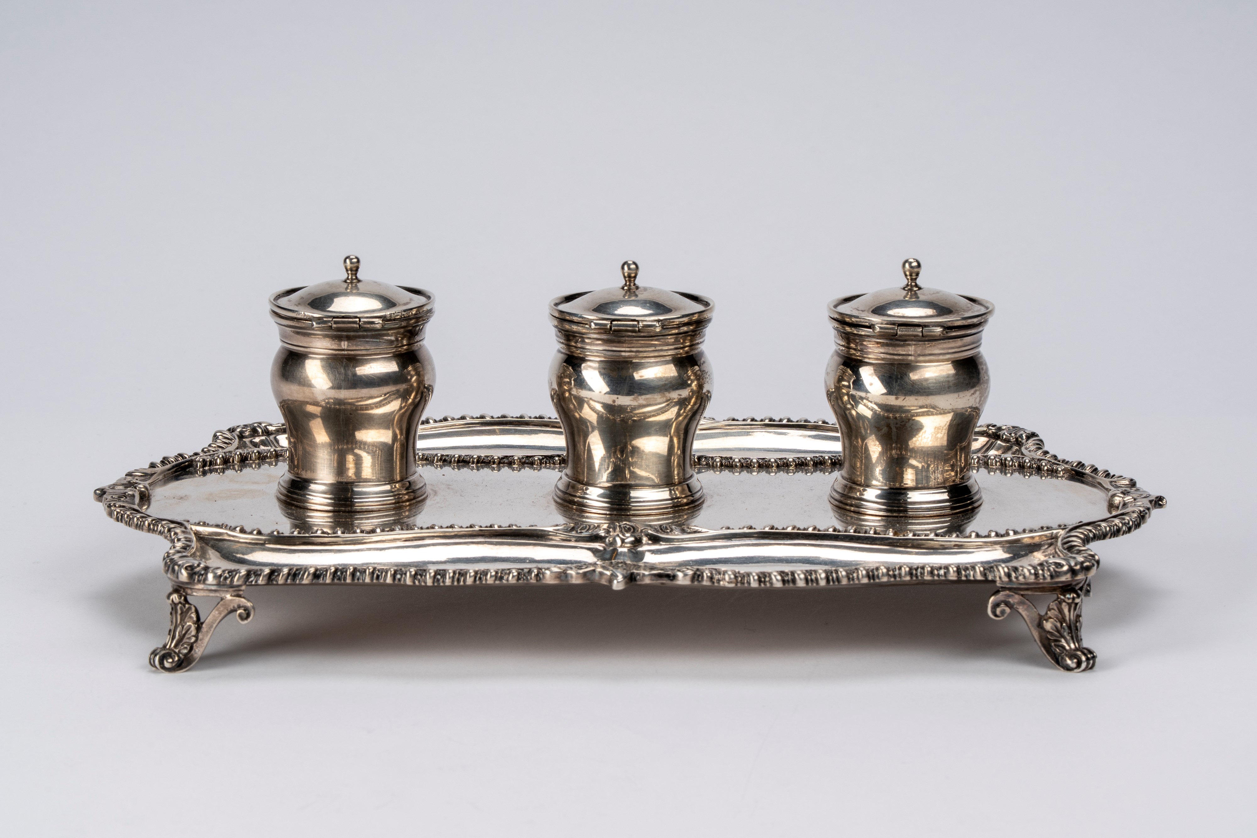 in argentoa base sagomata decorata sul bordo con cordonatura stilizzata, piccole volute e quattro piedini mossi, parte superiore con tre contenitori porta inchiostro a corpo tornito con coperchi decorati da leoni araldici incisi.