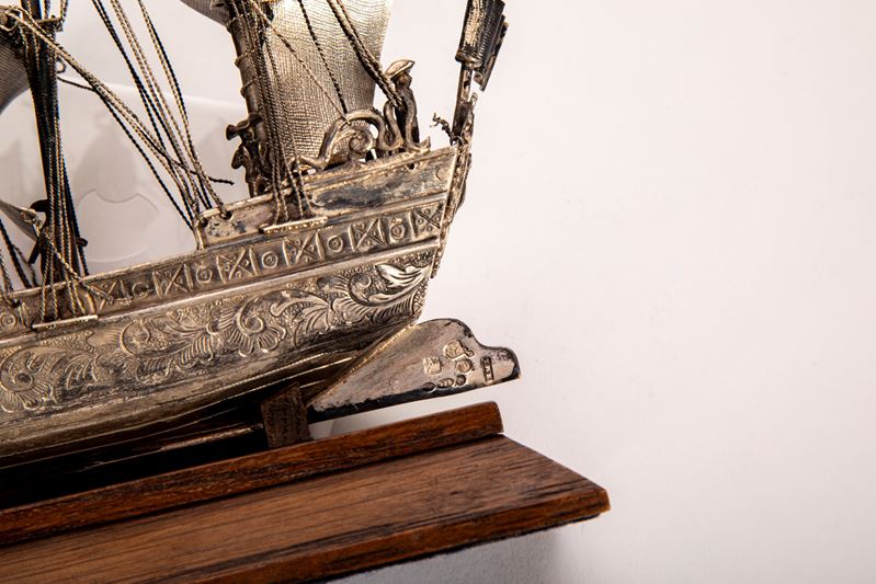 in argento 925modellato a tutto tondo con vele spiegate, base in legno intagliato a simulare moto ondoso con targhetta esplicativa, scatola in legno.