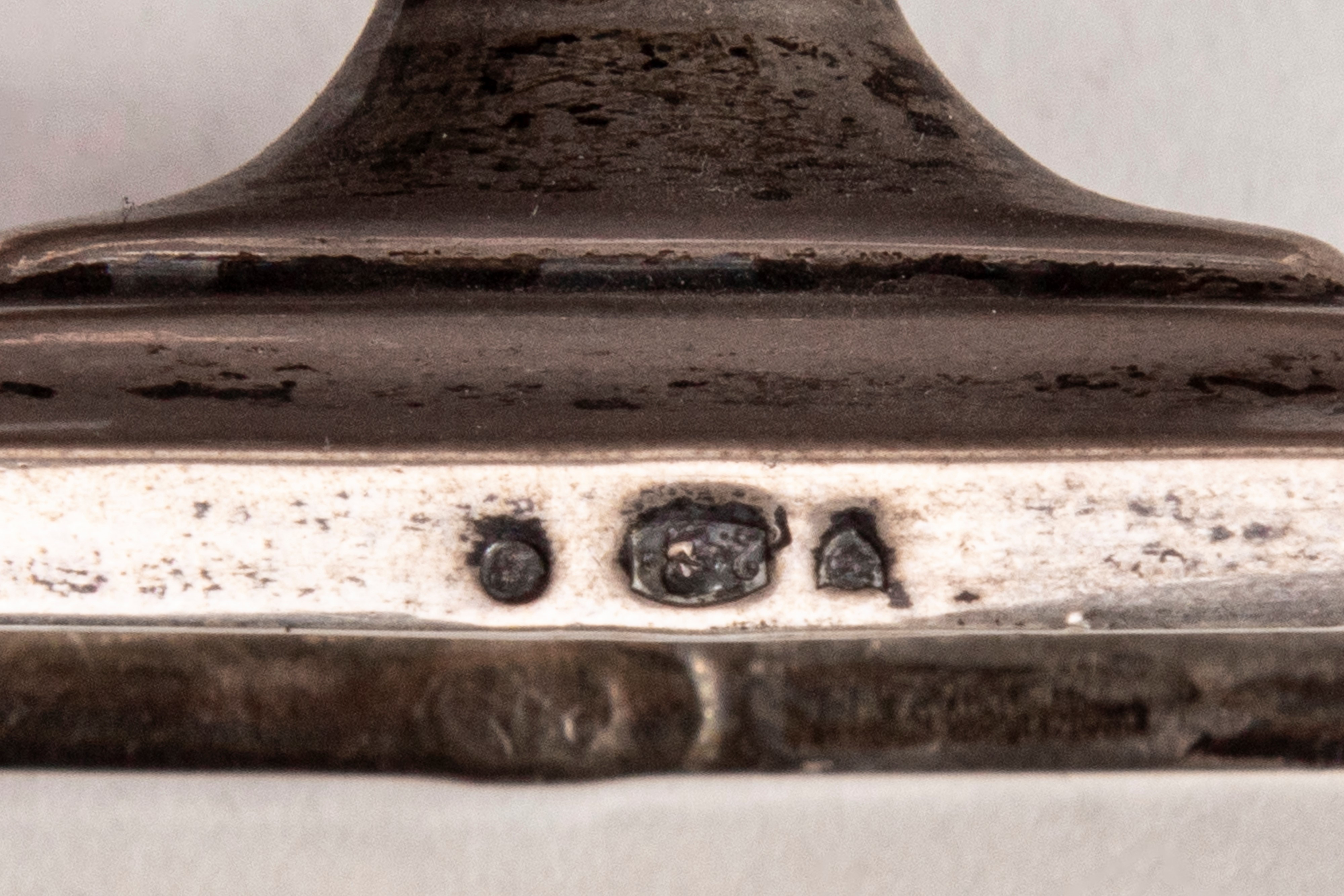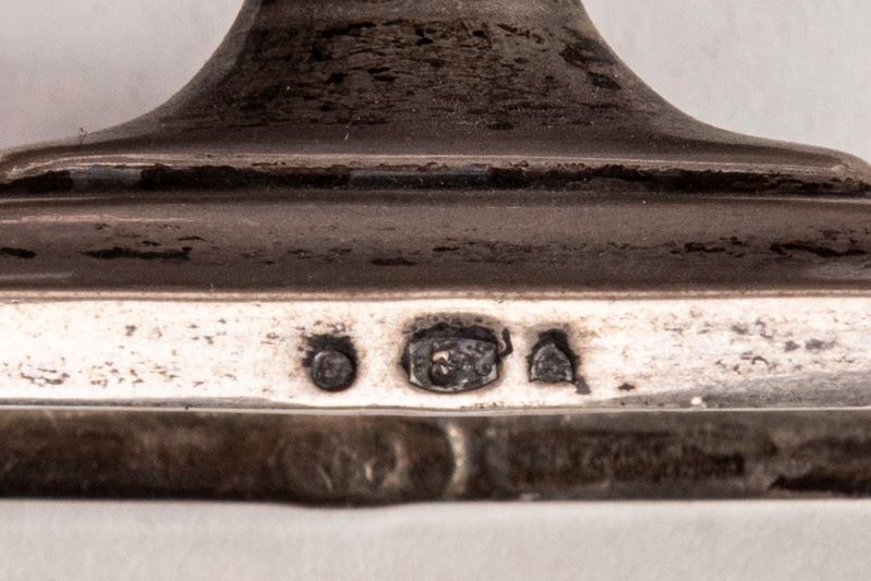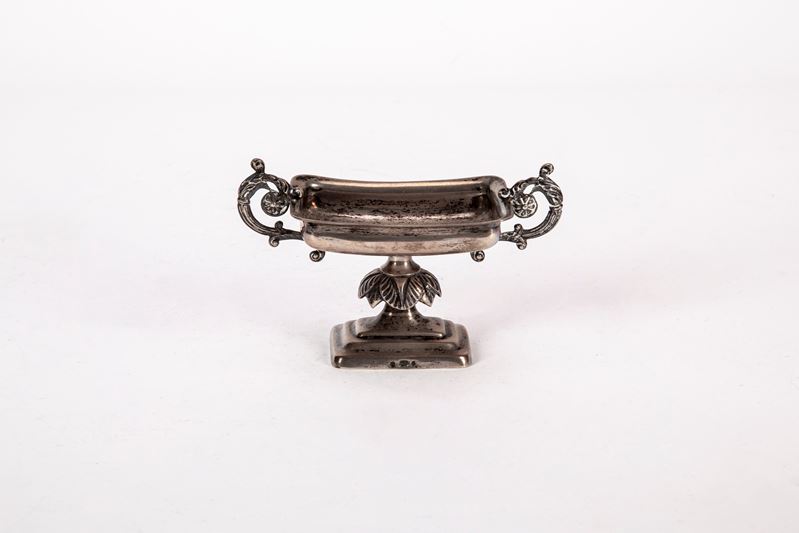 di forma rettangolare, anse laterali cesellate a volute, parte centrale tornita con foglie cesellate in rilievo poggiante su piede squadrato.
