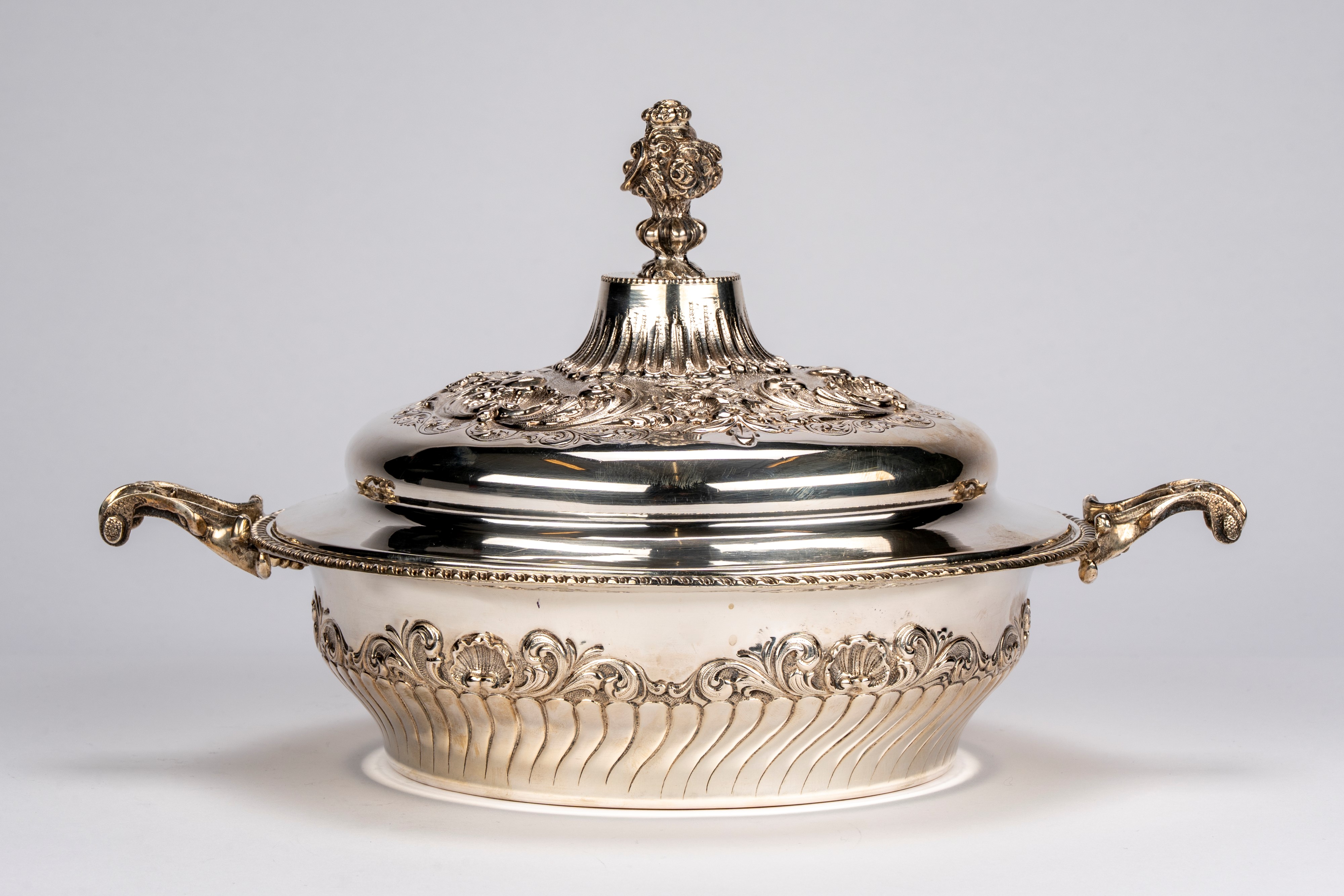 di forma tonda a corpo sbalzato a volute con conchiglie stilizzate, presa del coperchio cesellata a pigna, due prese laterali.