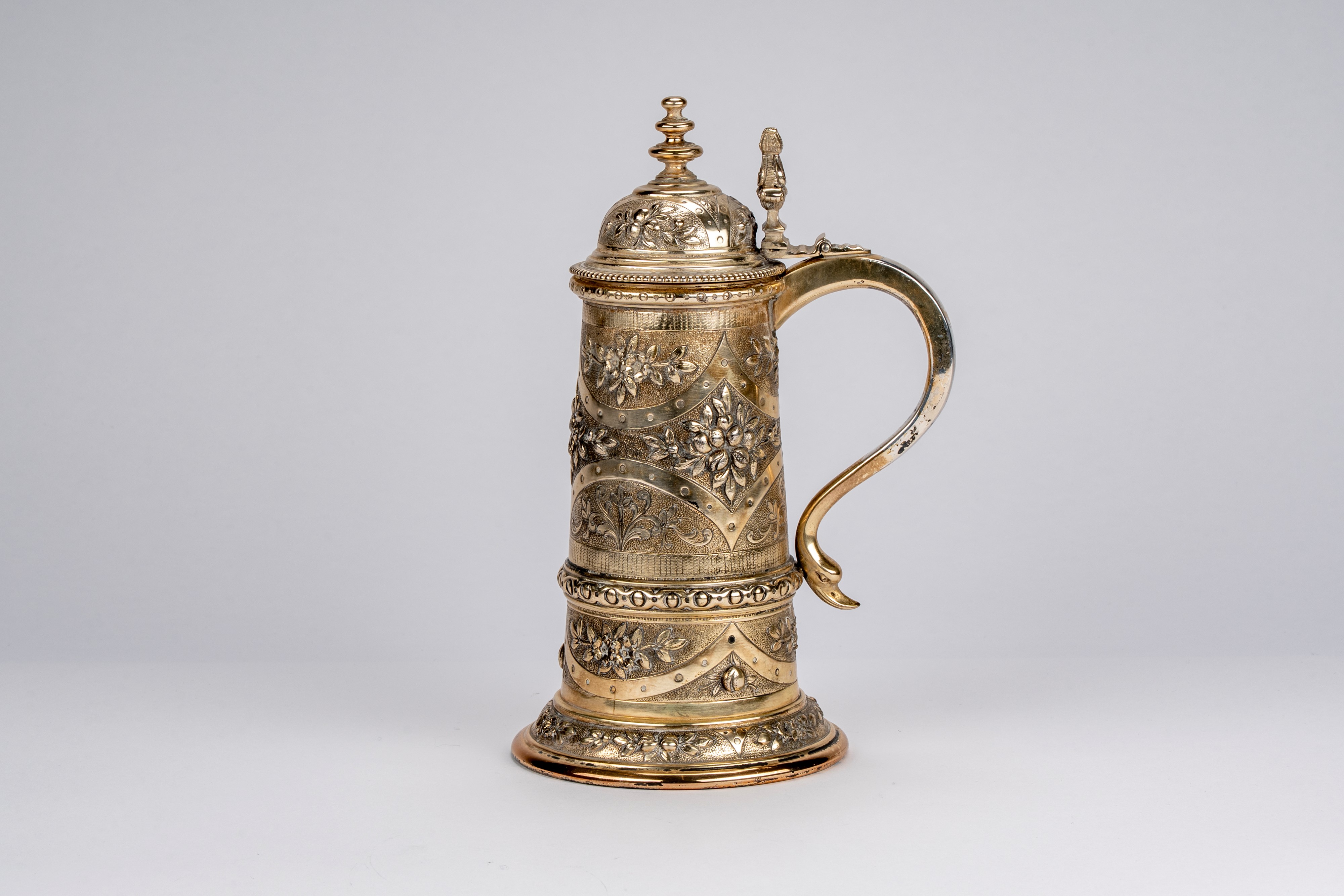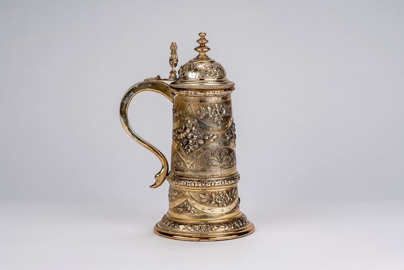 corpo riccamente sbalzato e inciso a motivi floreali frutti e foglie, coperchio a cupola con presa tornita, manico sagomato terminante a testa di cigno stilizzata.