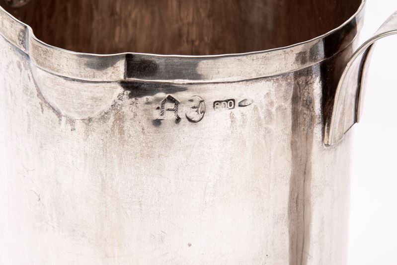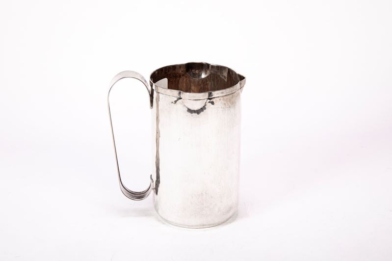 in argentodi forma cilindrica con corpo decorato a leggere martellature, presa laterale sagomata.