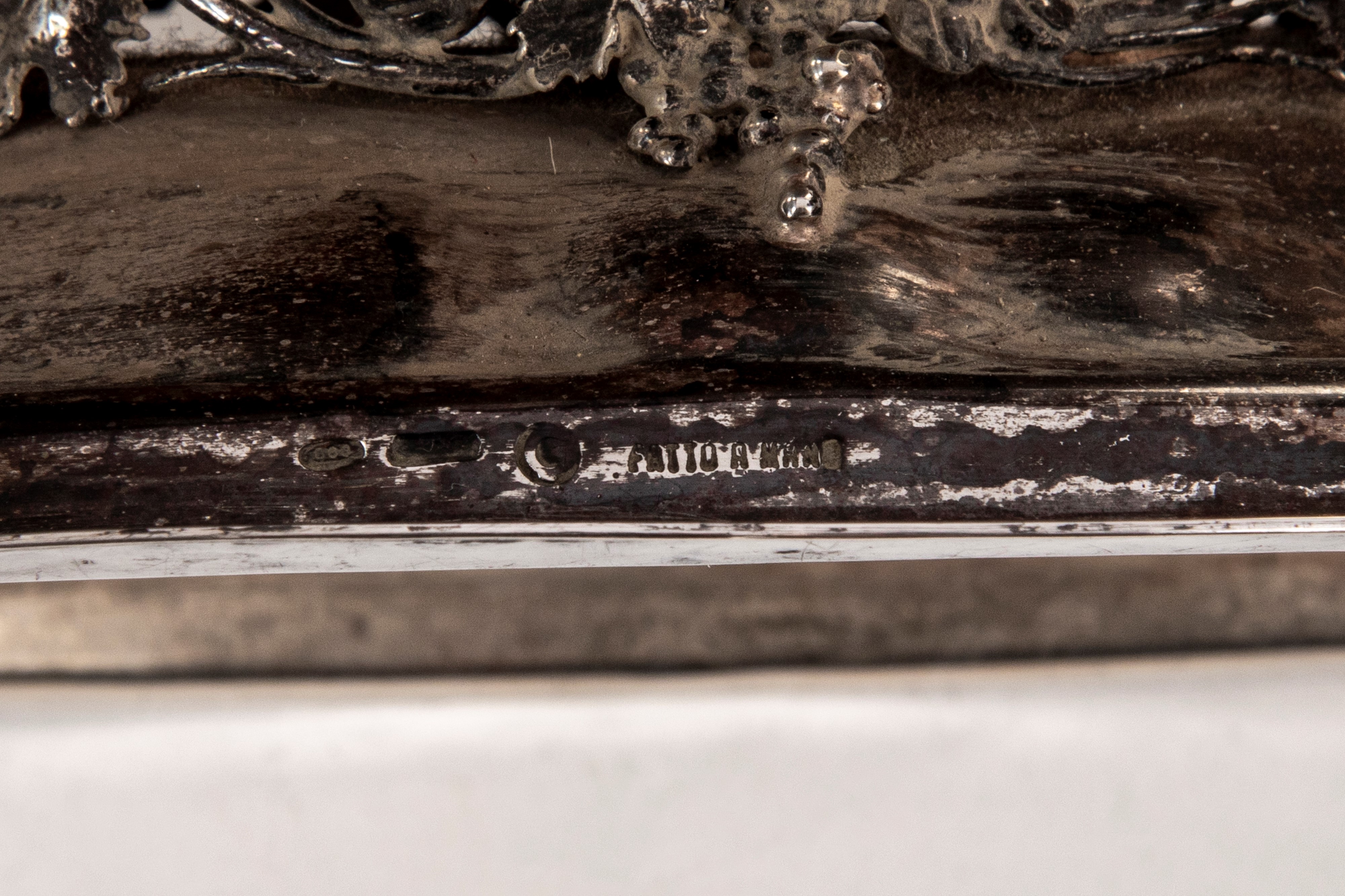 di forma ovoidale con bordo sagomato, anse cesellate a tralci di vite ed uva, poggiante su base ovoidale.