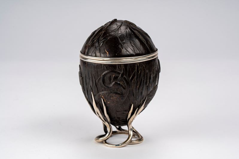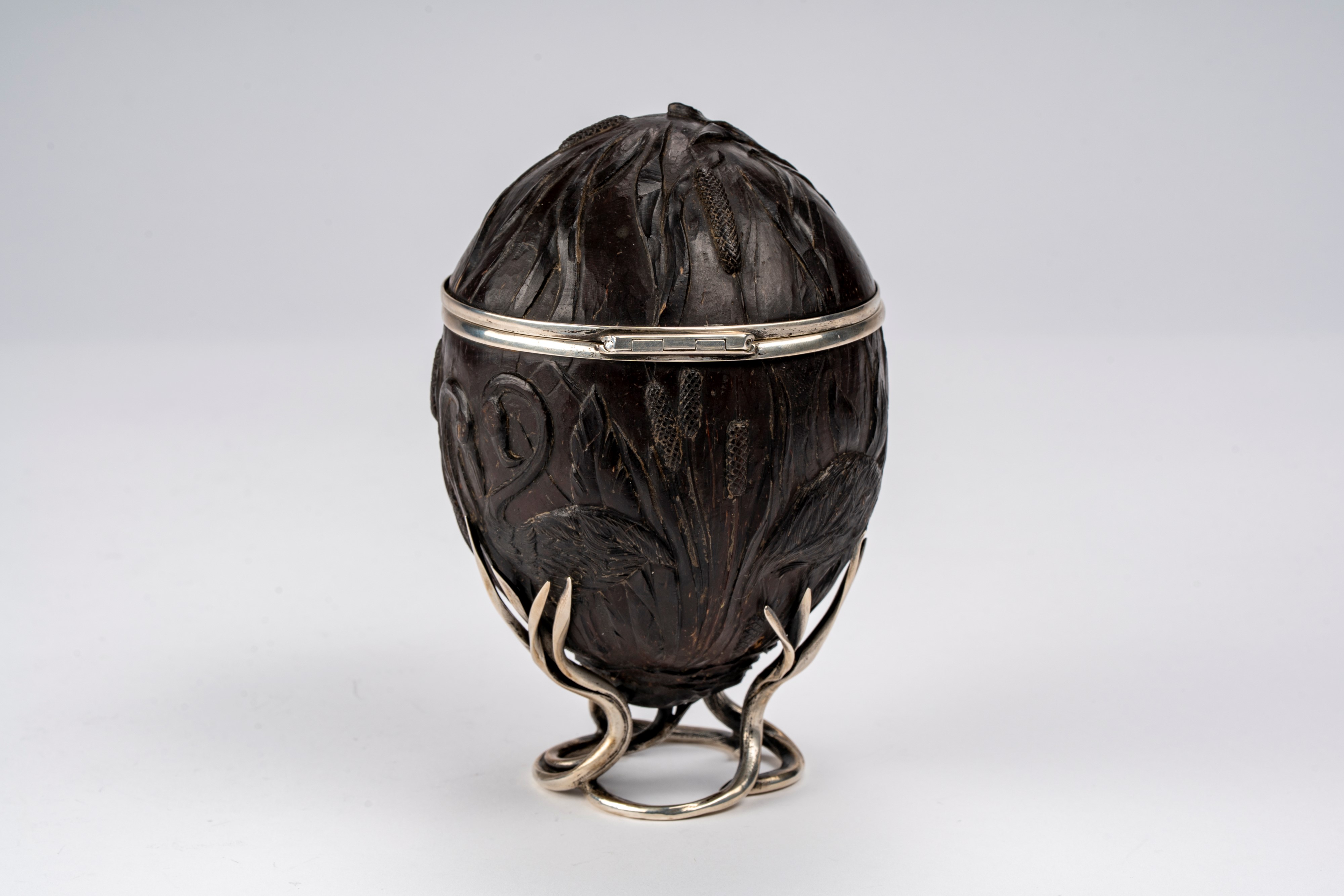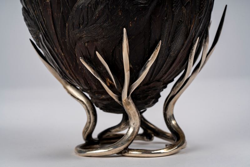 con struttura in noce di cocco scolpita a cigni in uno stagno, interno e base in argento cesellato a ramificazioni.