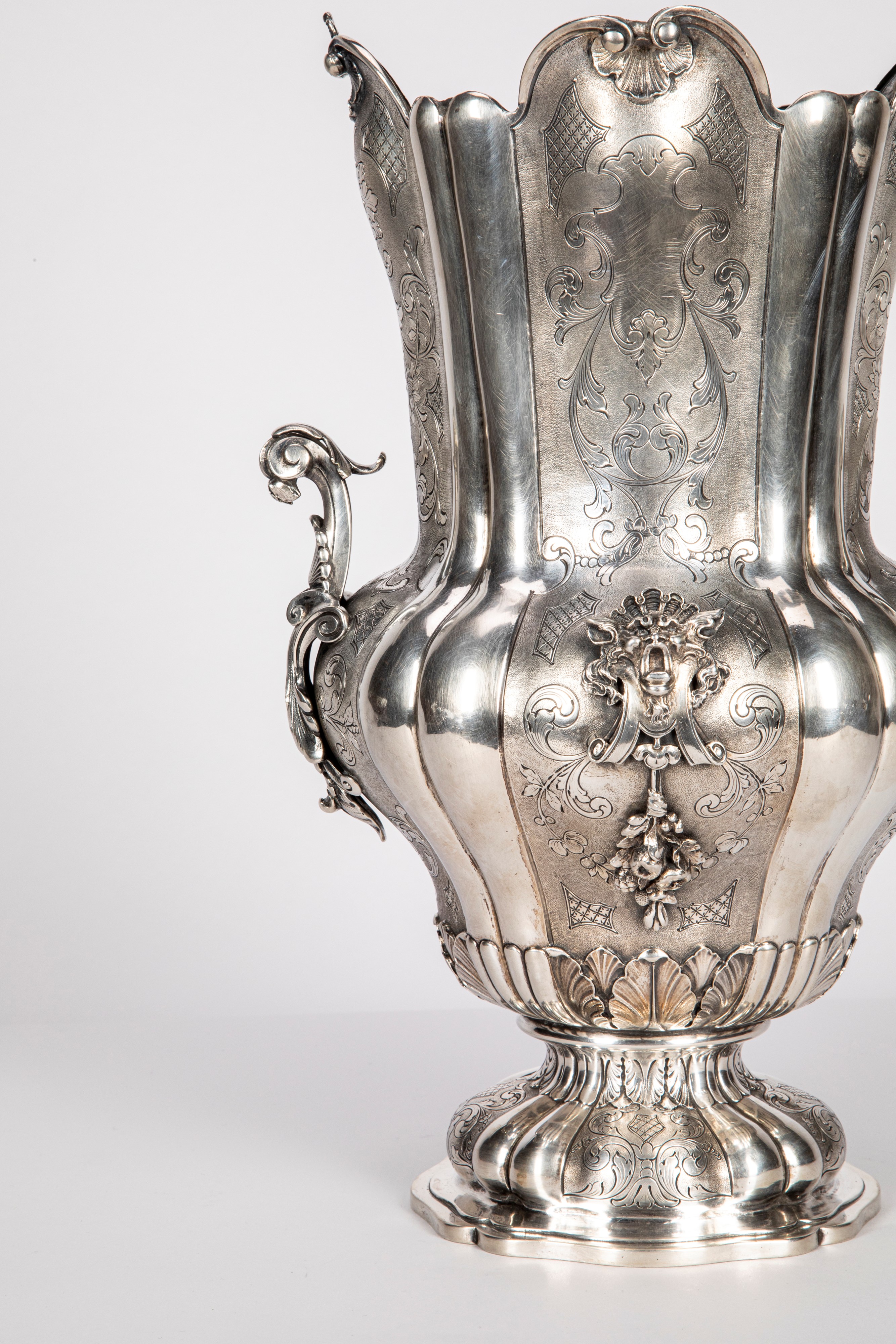 a corpo bombato decorato a fasce alternate con incisioni a volute e motivi geometrici, applicazioni cesellate con grottesche, anse laterali mosse.