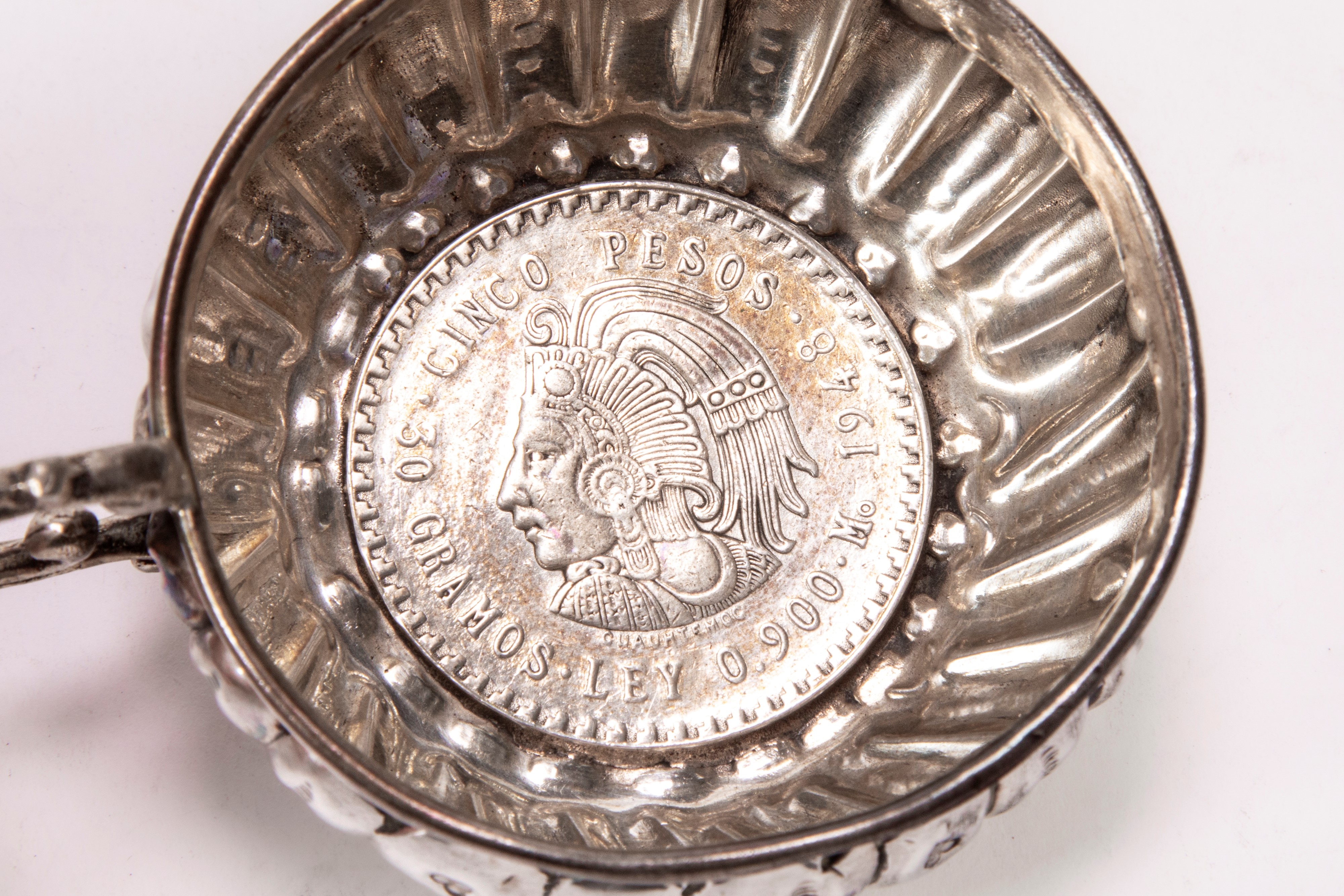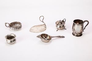 in argentocomposto da saliera, colino, piccolo boccale, due posaceneri e un vasetto.