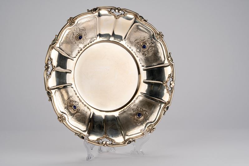 in argentodi forma circolare con bordo cesellato, fascia con nicchie decorate a incisioni e pietre dure cabochon.