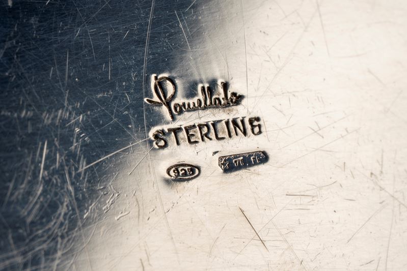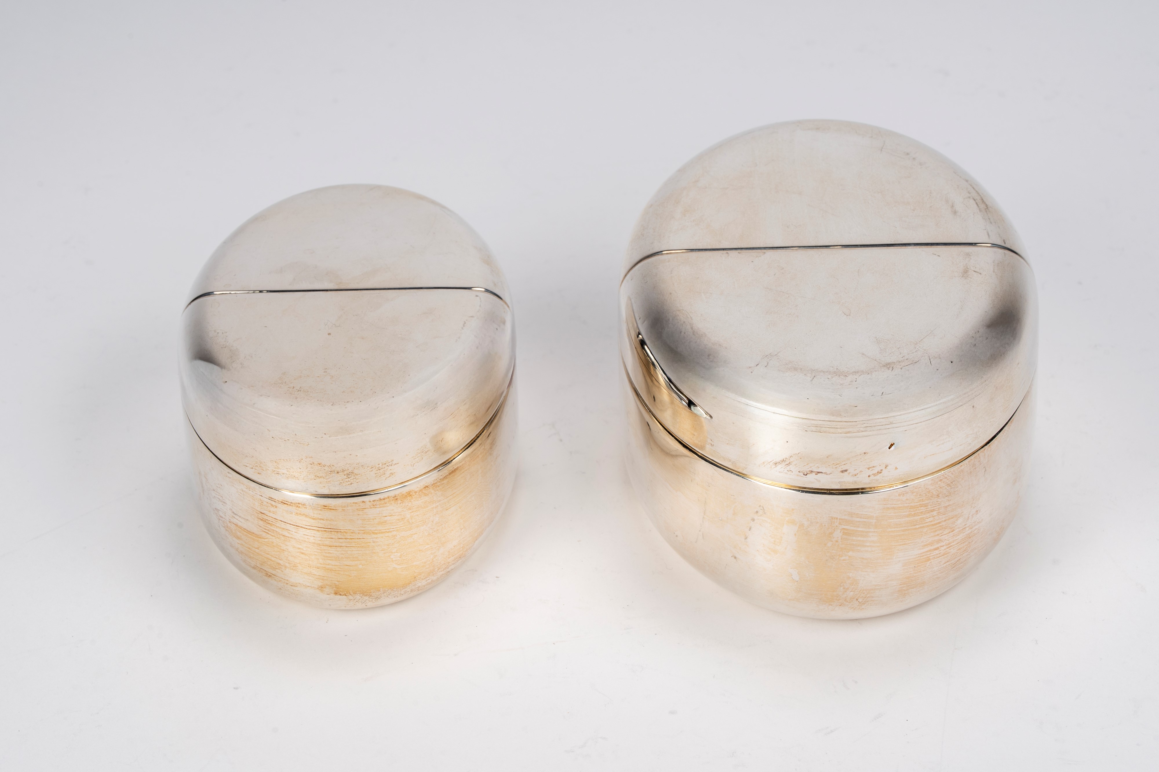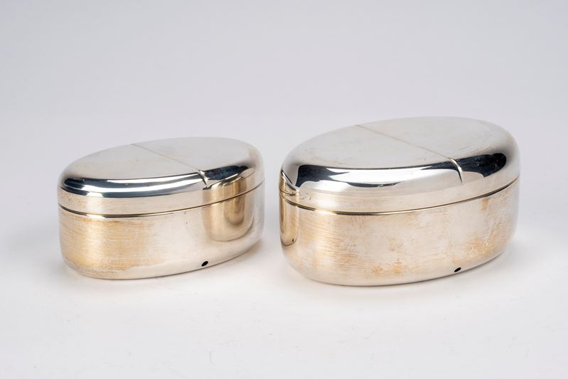 in argento 925a corpo ovoidale, a scalare, con incisione longitudinale sul coperchio per chiusura con passante, in custodia originale.