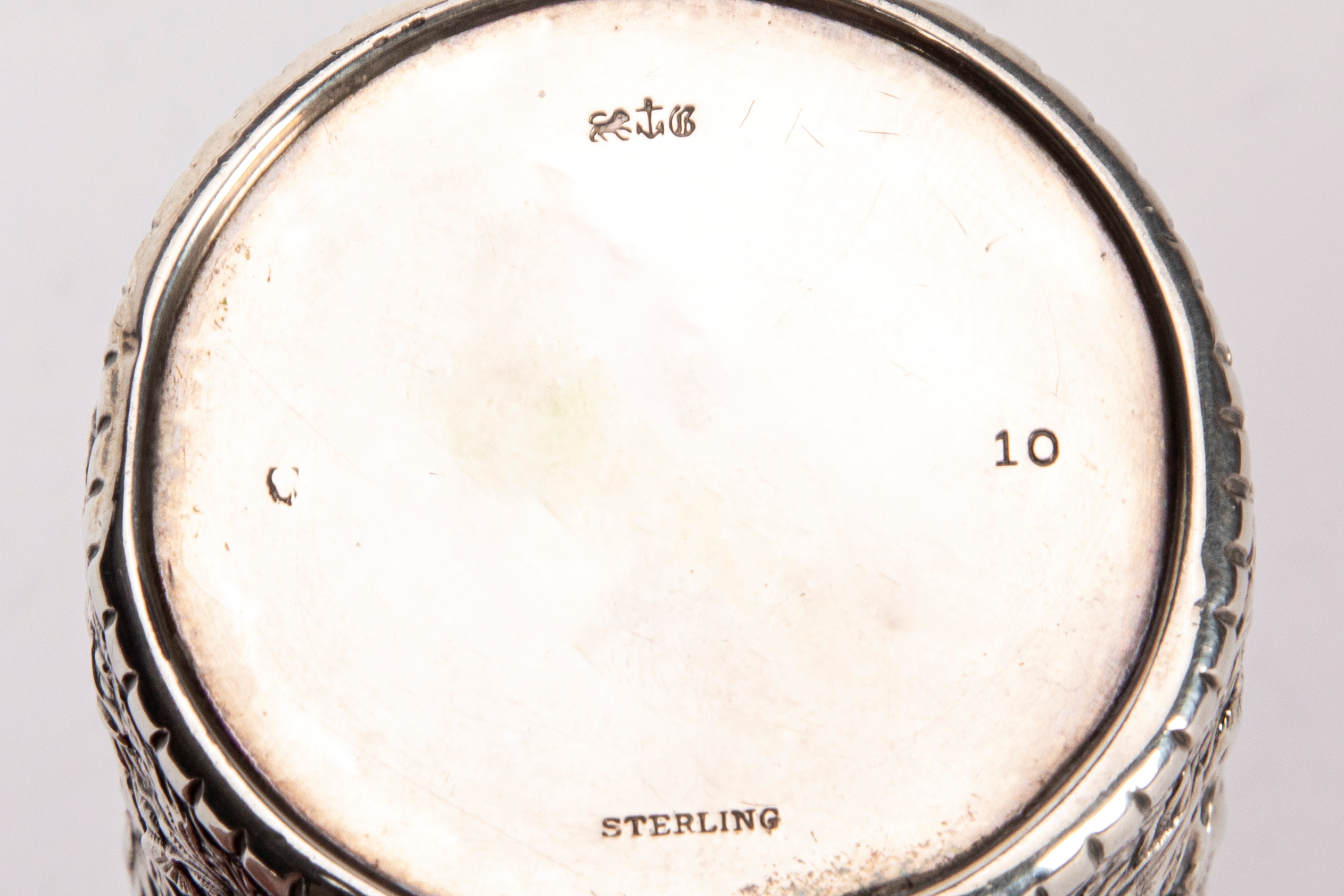 in argentodi forma cilindrica con corpo sbalzato a motivi floreali e foglie.
