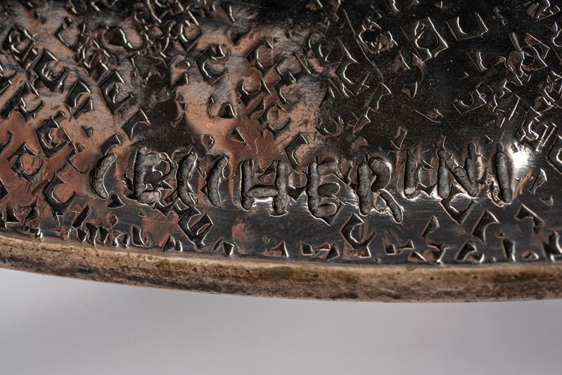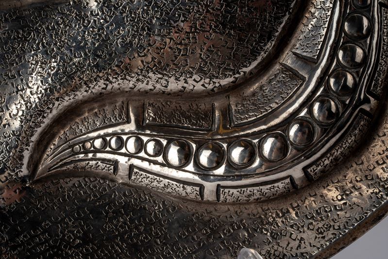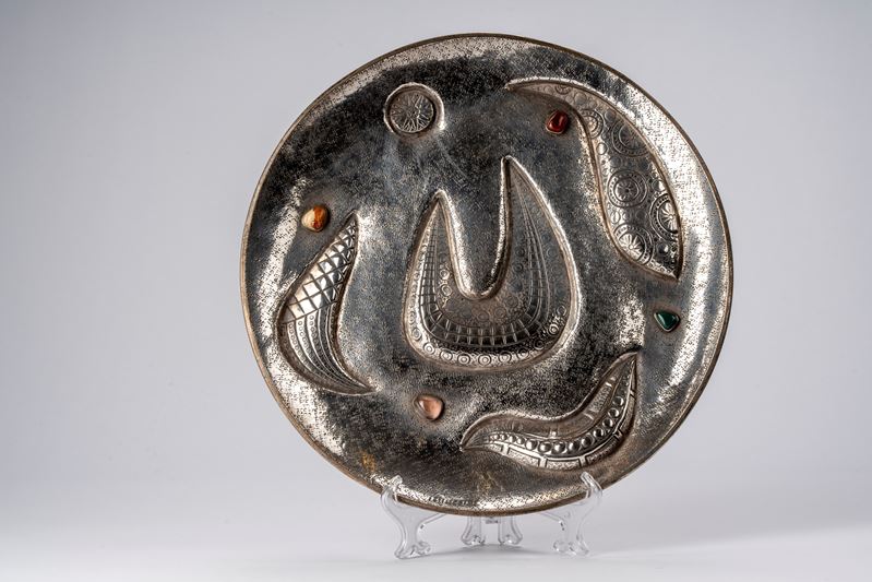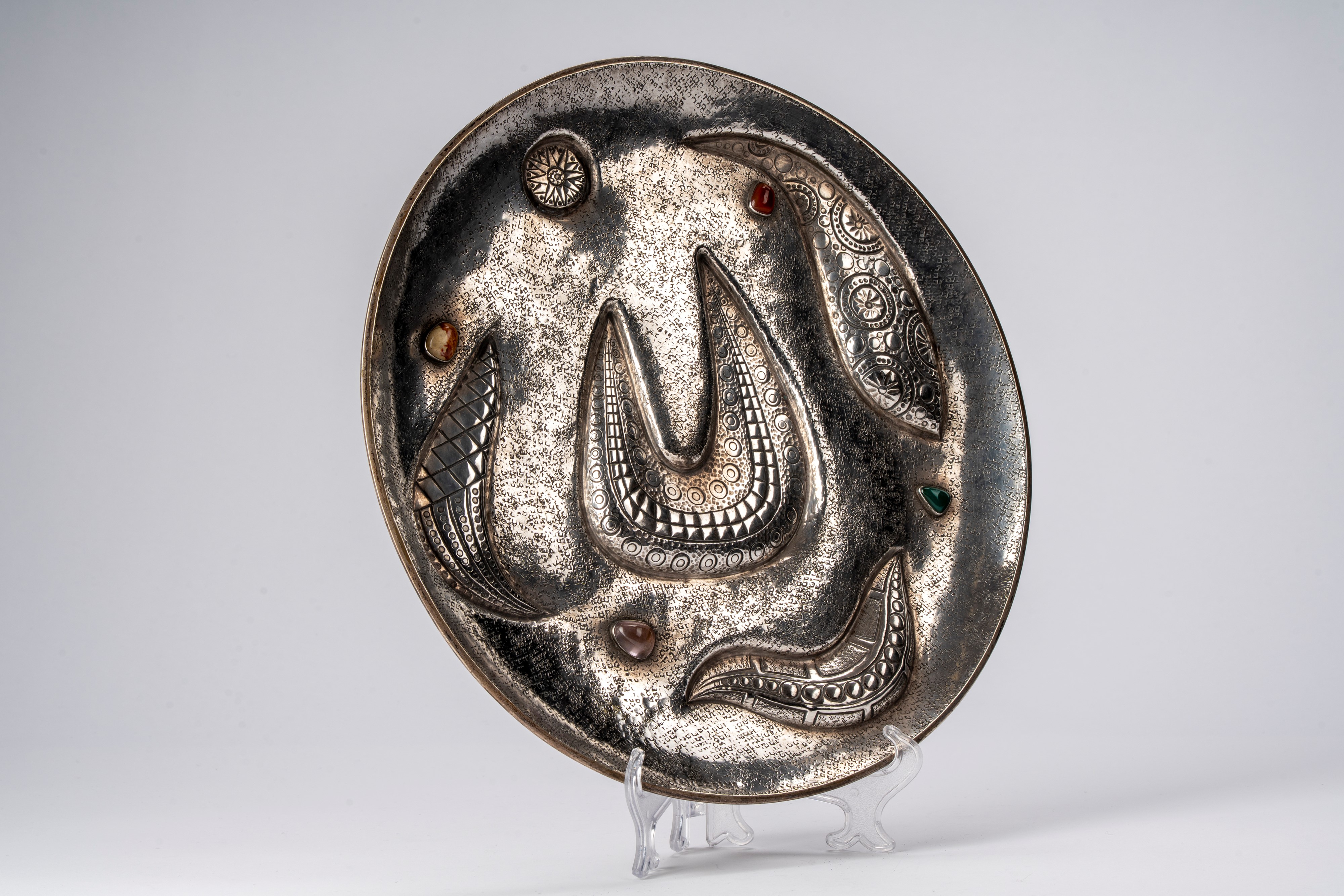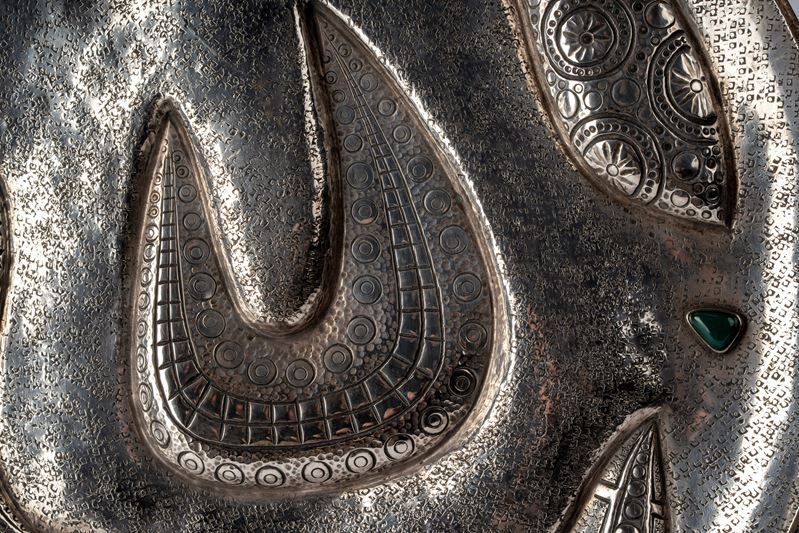 in argentocon cavetto sbalzato a motivi di gusto tribale ed incisioni martellate, decori in rilievo con pietre dure cabochon policrome, firmato dall’autore in basso al centro, firmato e punzonato alla base.