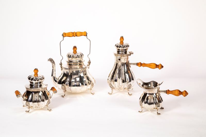 in argentocomposto da teiera, cioccolatiera, lattiera e zuccheriera a corpo bombato decorato a costolature e leggera martellatura superficiale, gambe cesellate e terminanti a ricciolo, prese in legno tornito.