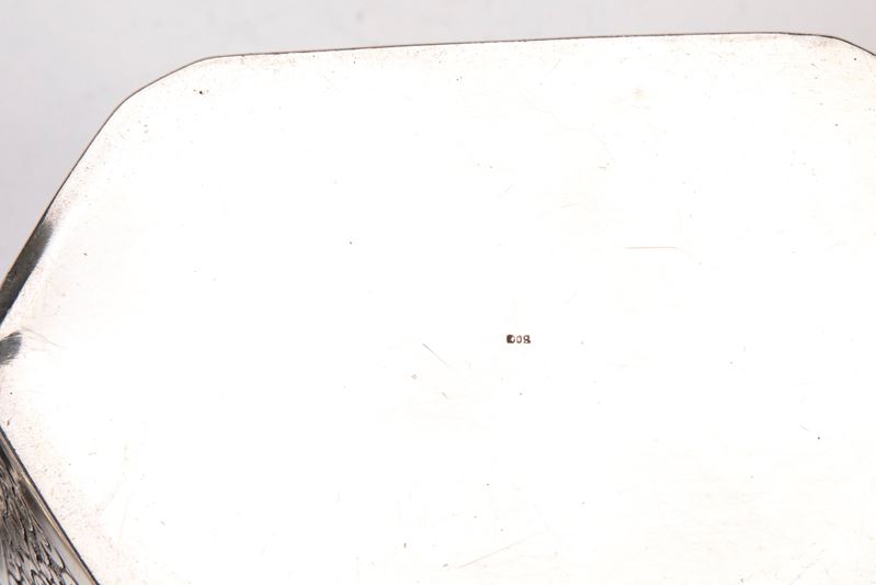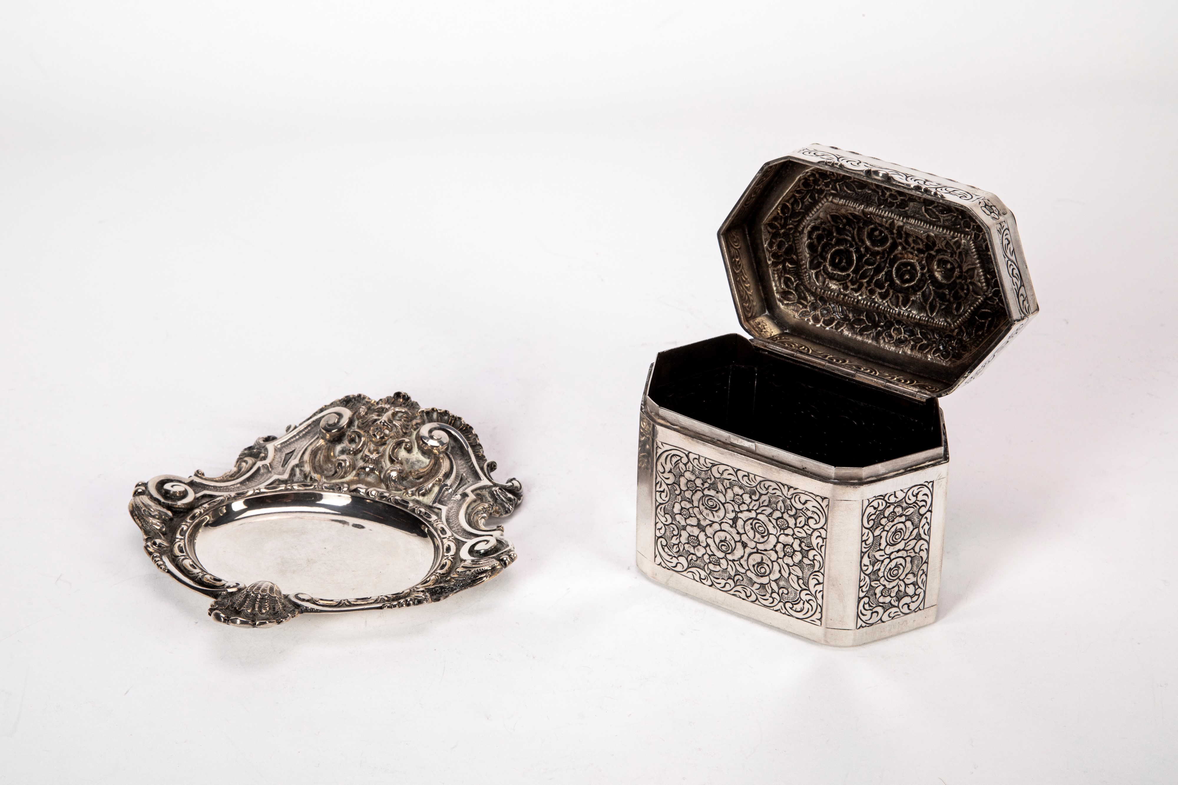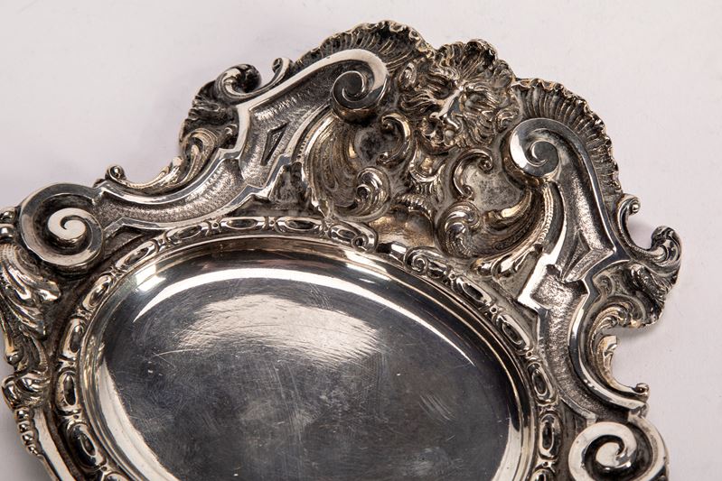 la scatola di forma esagonale con decoro a sbalzo e inciso a motivi floreali, vassoietto inglese con cesellature a volute e mascherone centrale.