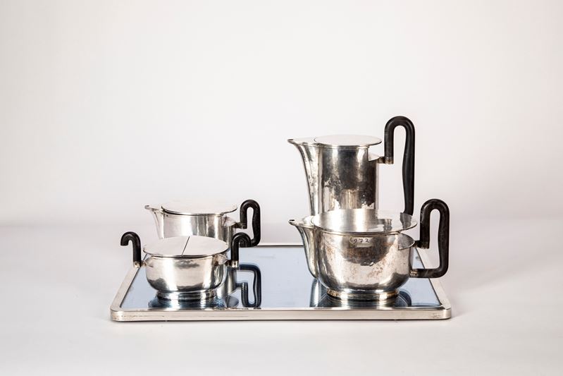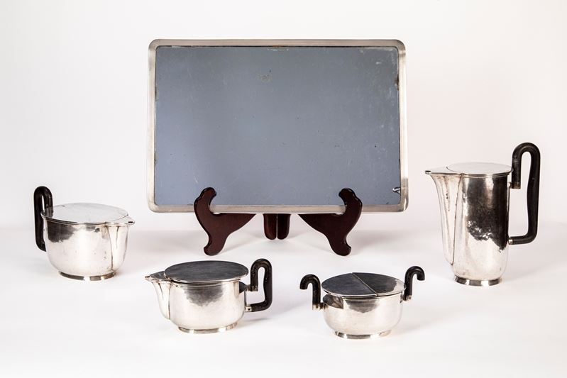 a corpo parzialmente ovoidale decorato da leggere martellature, prese in legno sagomato, composto da teiera lattiera caffettiera e zuccheriera uniti ad un vassoio con profilo in argento e fondo a specchio.