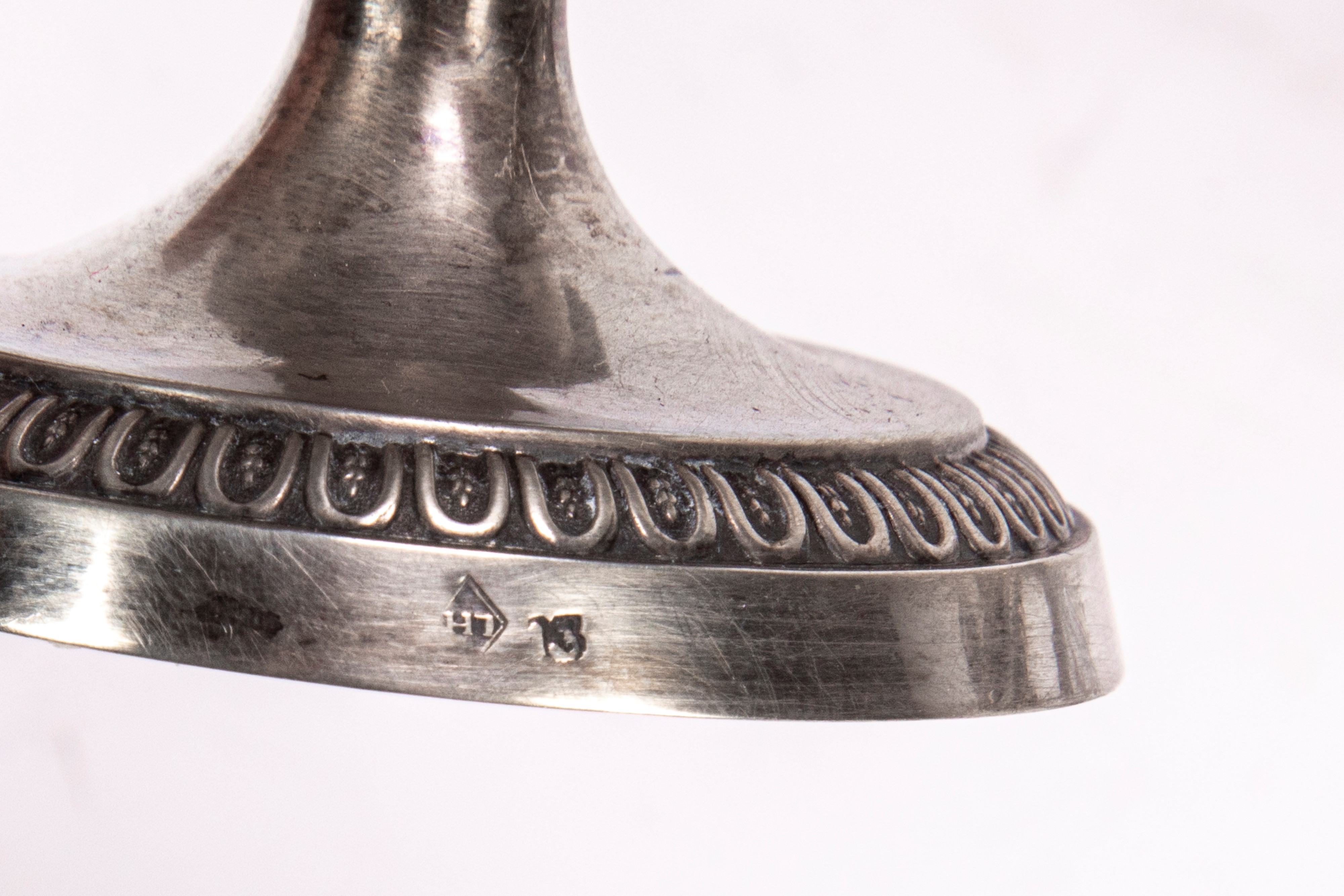 composto da due saliere e una senapiera con struttura di forma circolare decorati in rilievo a foglie di vite con uva e con anse laterali a ricciolo. Piede circolare. Uniti 4 cucchiaini di diverso decoro. Difetti e mancanze.
