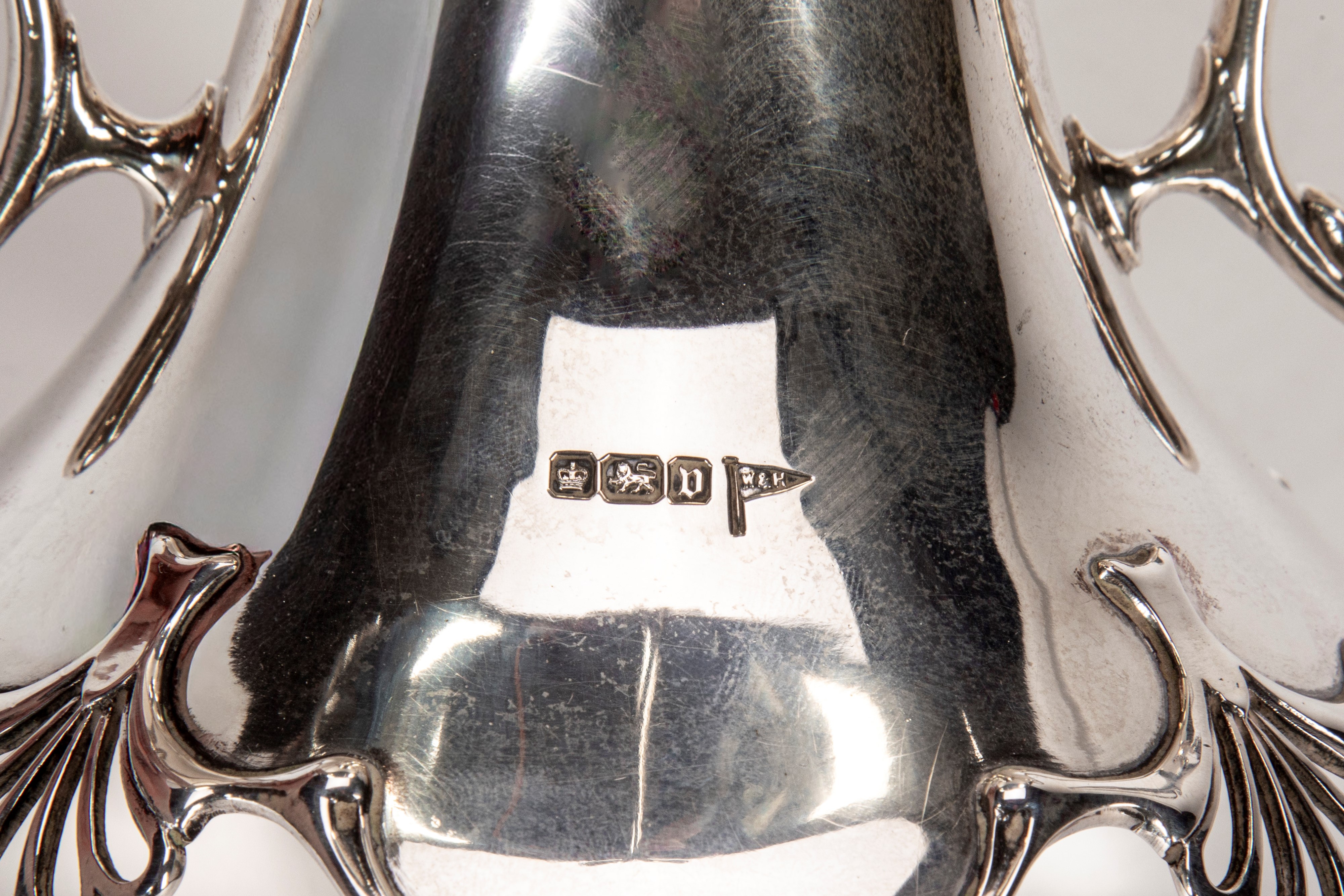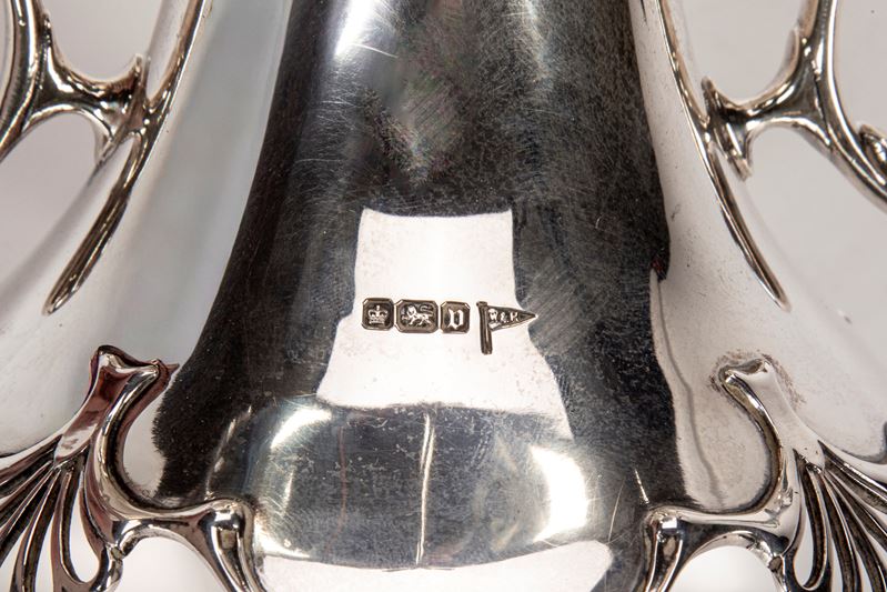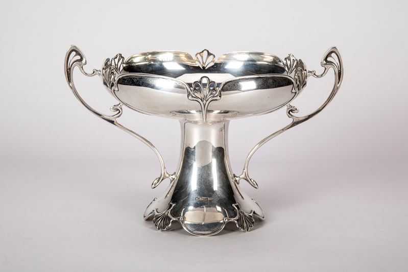 in argentodi gusto Liberty, con anse mosse e traforate, cavetto sbalzato a fiore di loto stilizzato, base mossa con sostegni traforati.
