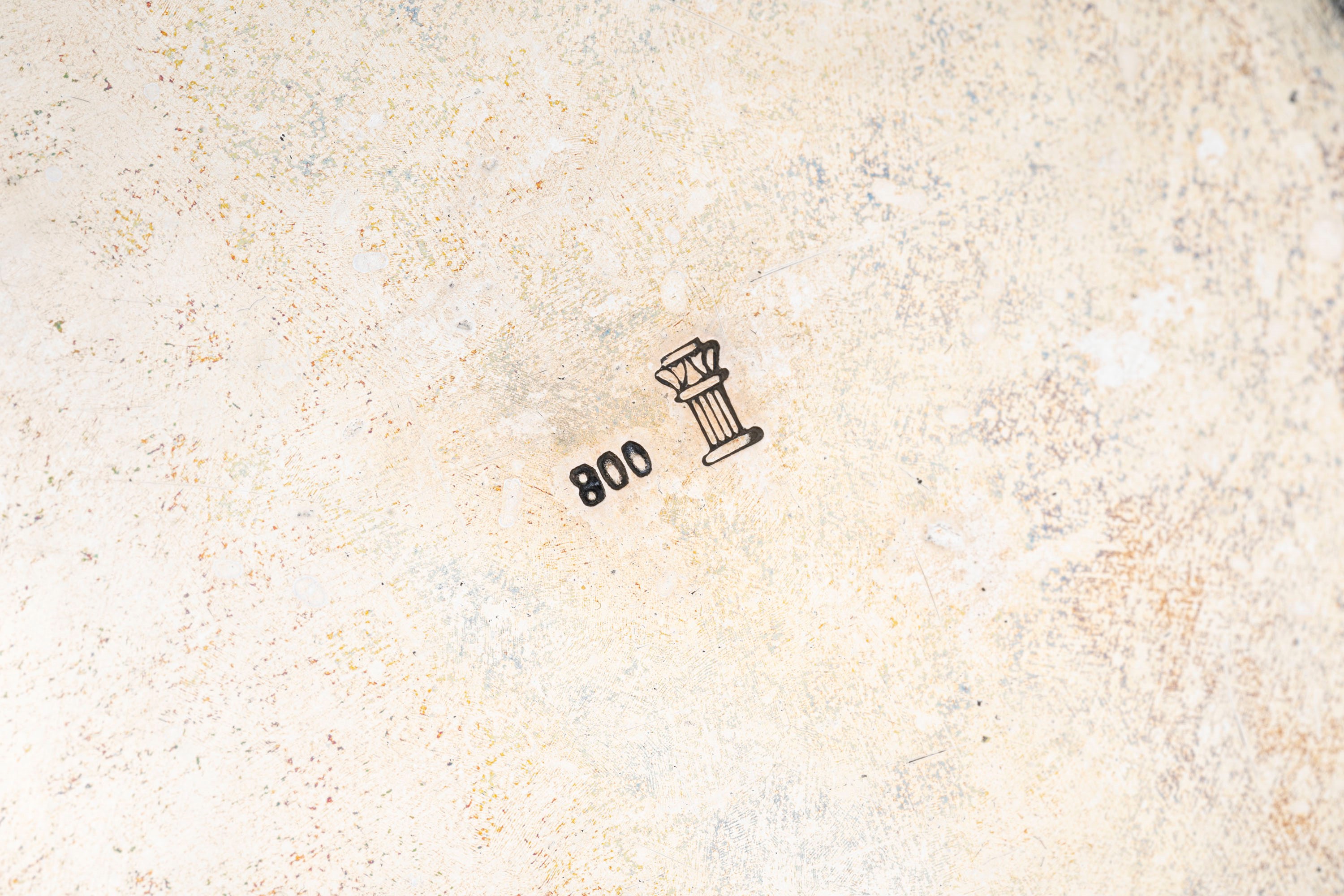 in argentodi forma circolare, poggiante su tre piedini, interamente decorato con motivi fogliacei e a volute.
