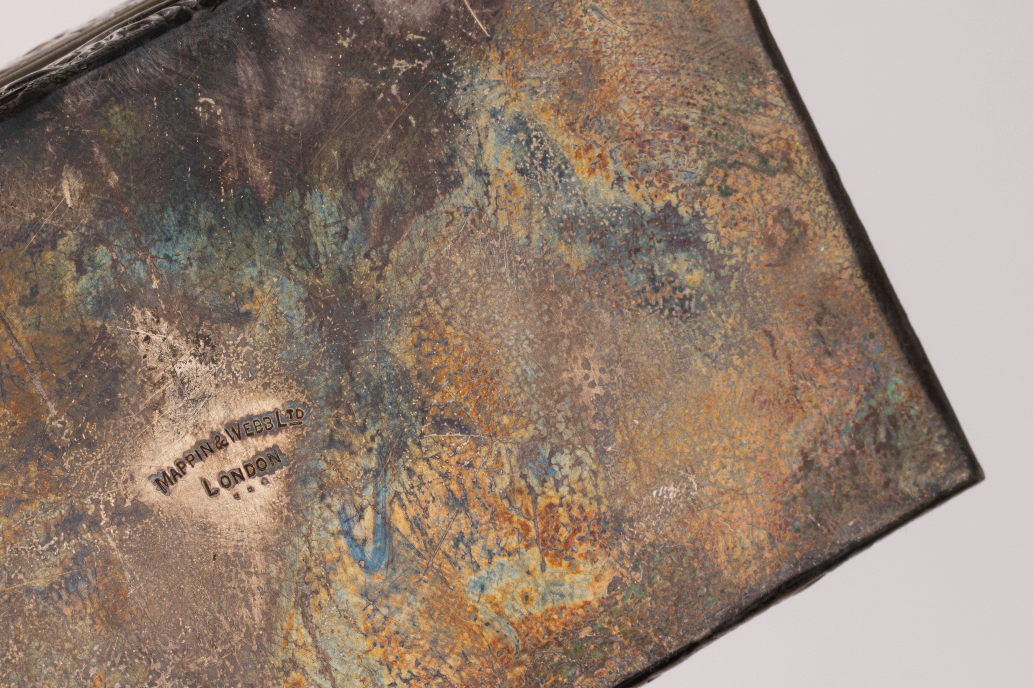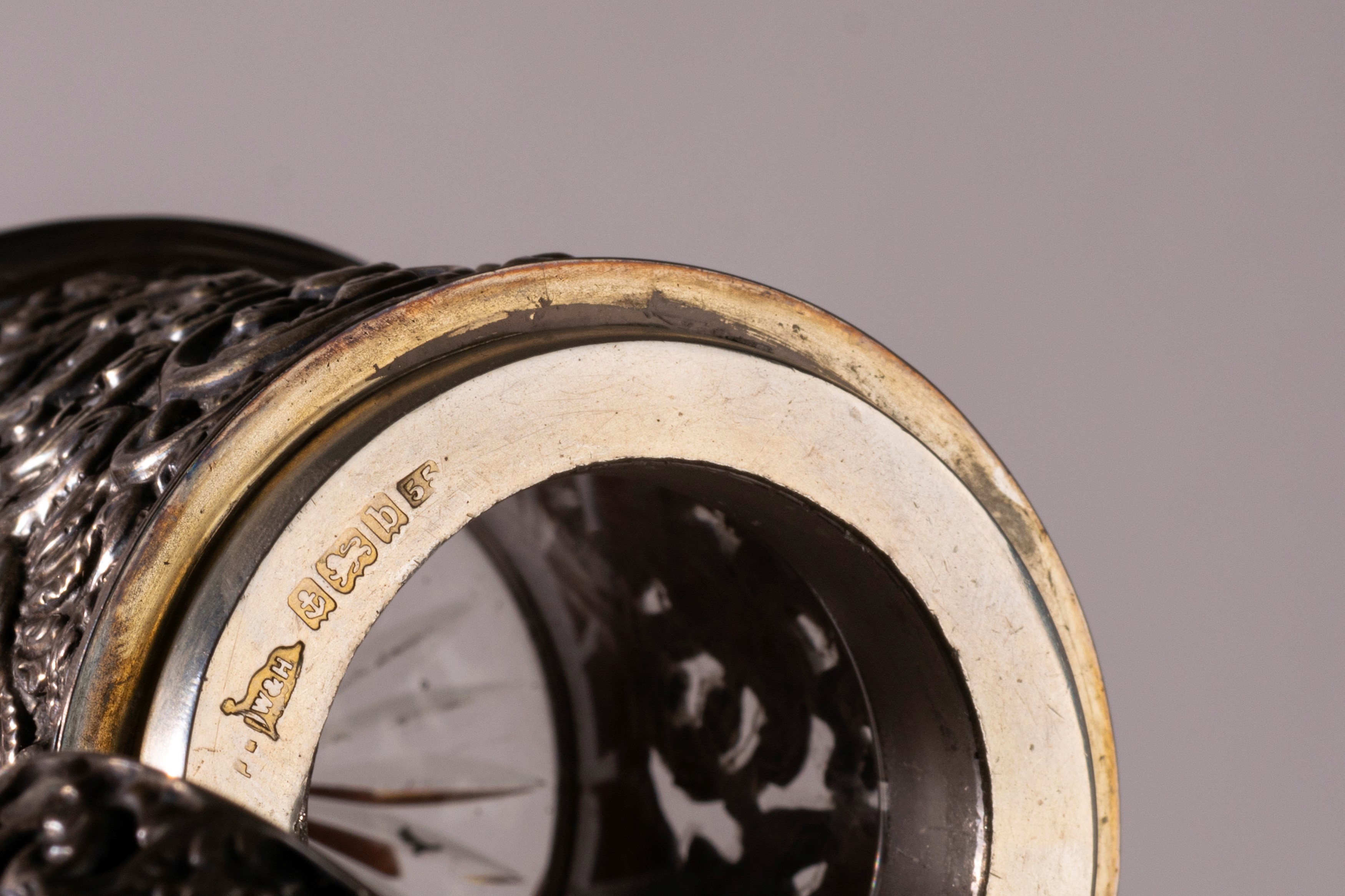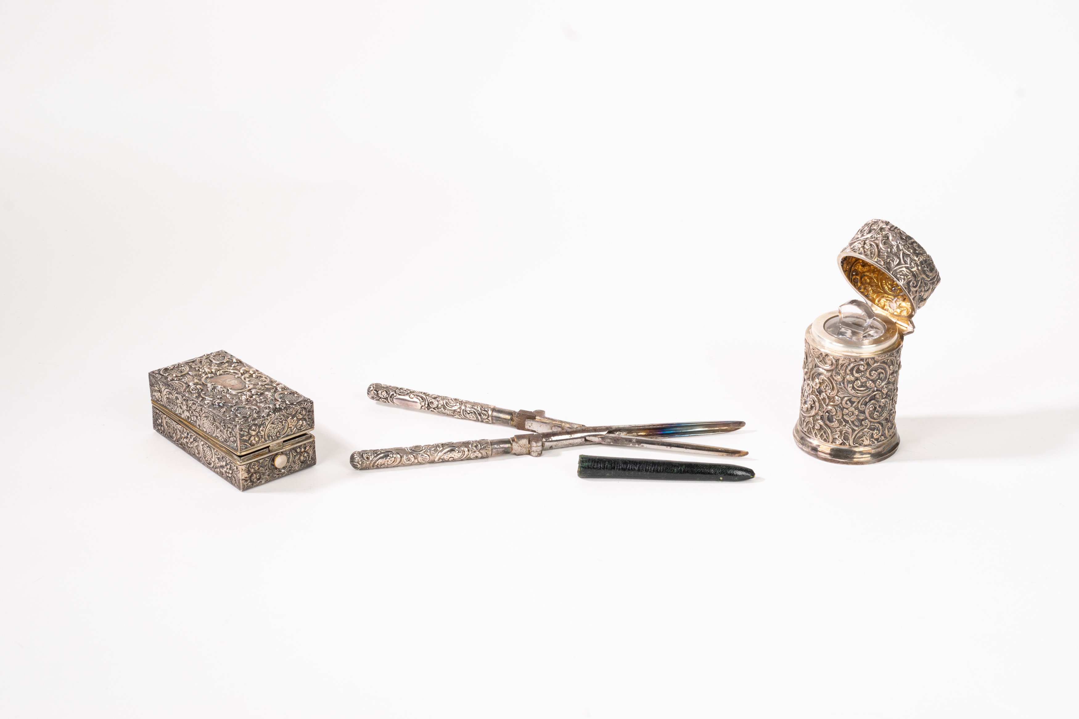 in argento 925 e vermeilinteramente cesellati e sbalzati con decori a rilievo, il portaprofumo punzonato Birmingham 1901 Walker and Hall, la stoppiniera Londra, Mappin and Webb.