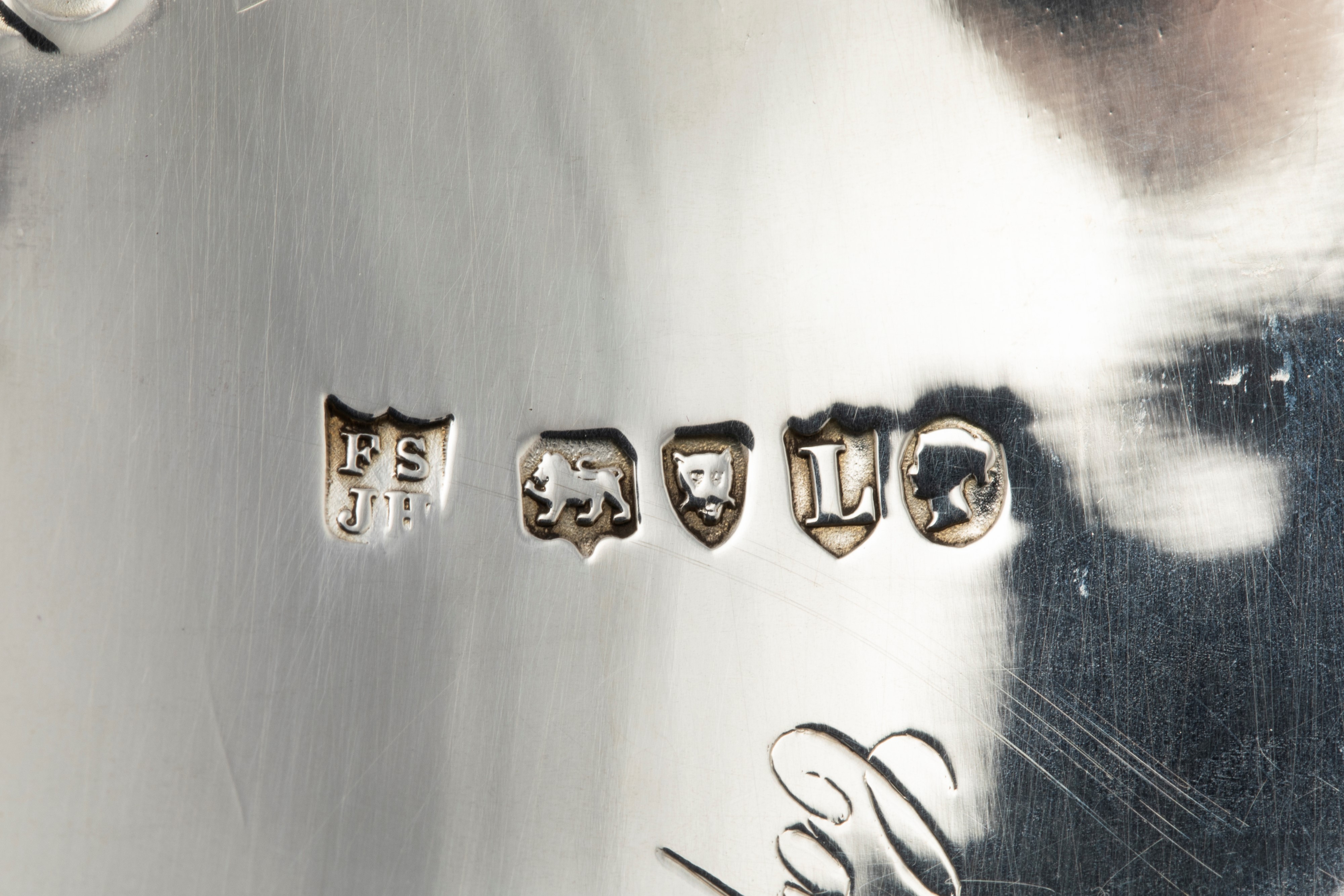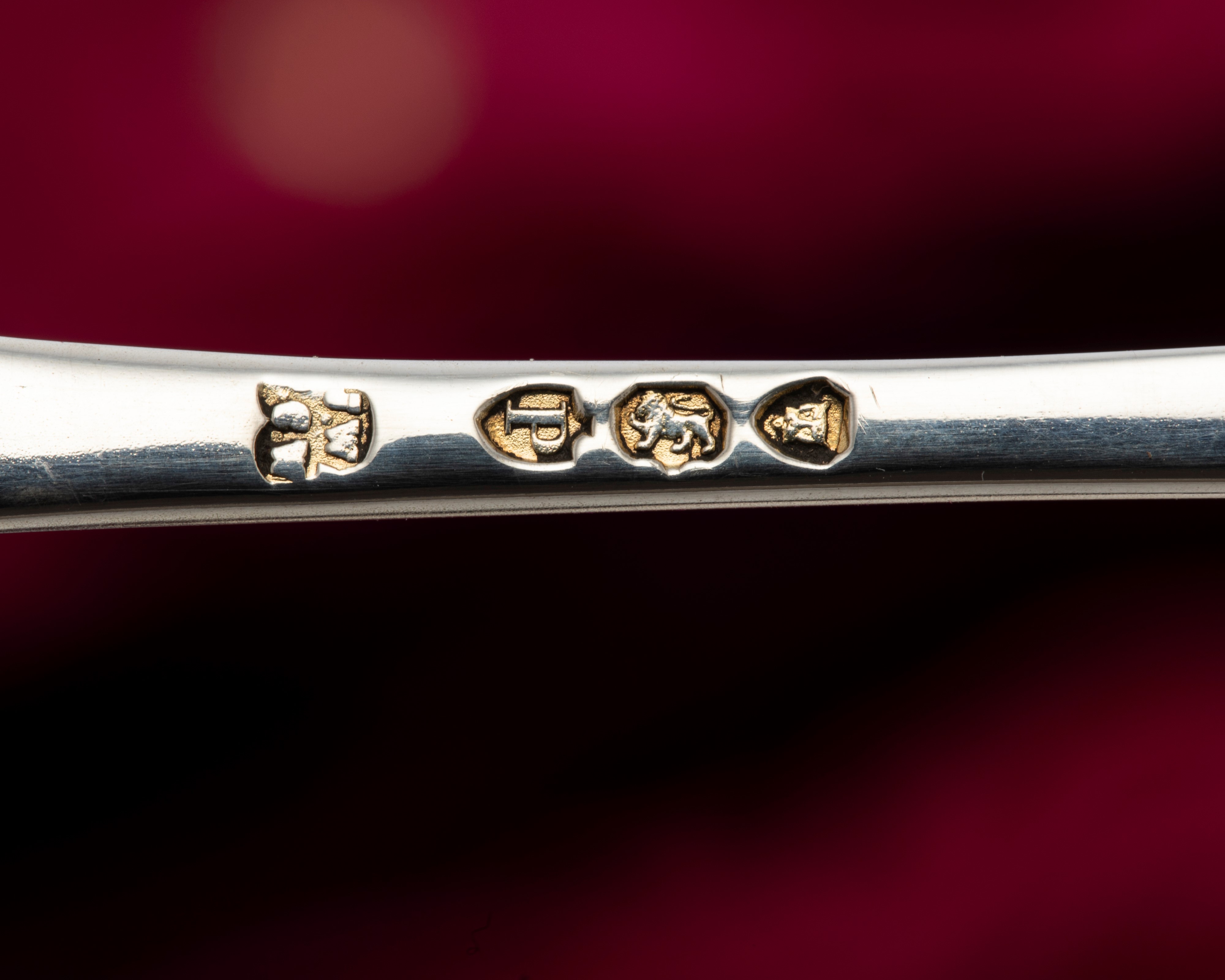 in argento 925la ciotola con punzoni dell'argentiere FSJH (Sibray, Hall & Co) baccellato a volute e inciso al centro; il cucchiao argentiere JWFCW (Wakely & Wheeler), Londra 1890; entro astuccio.