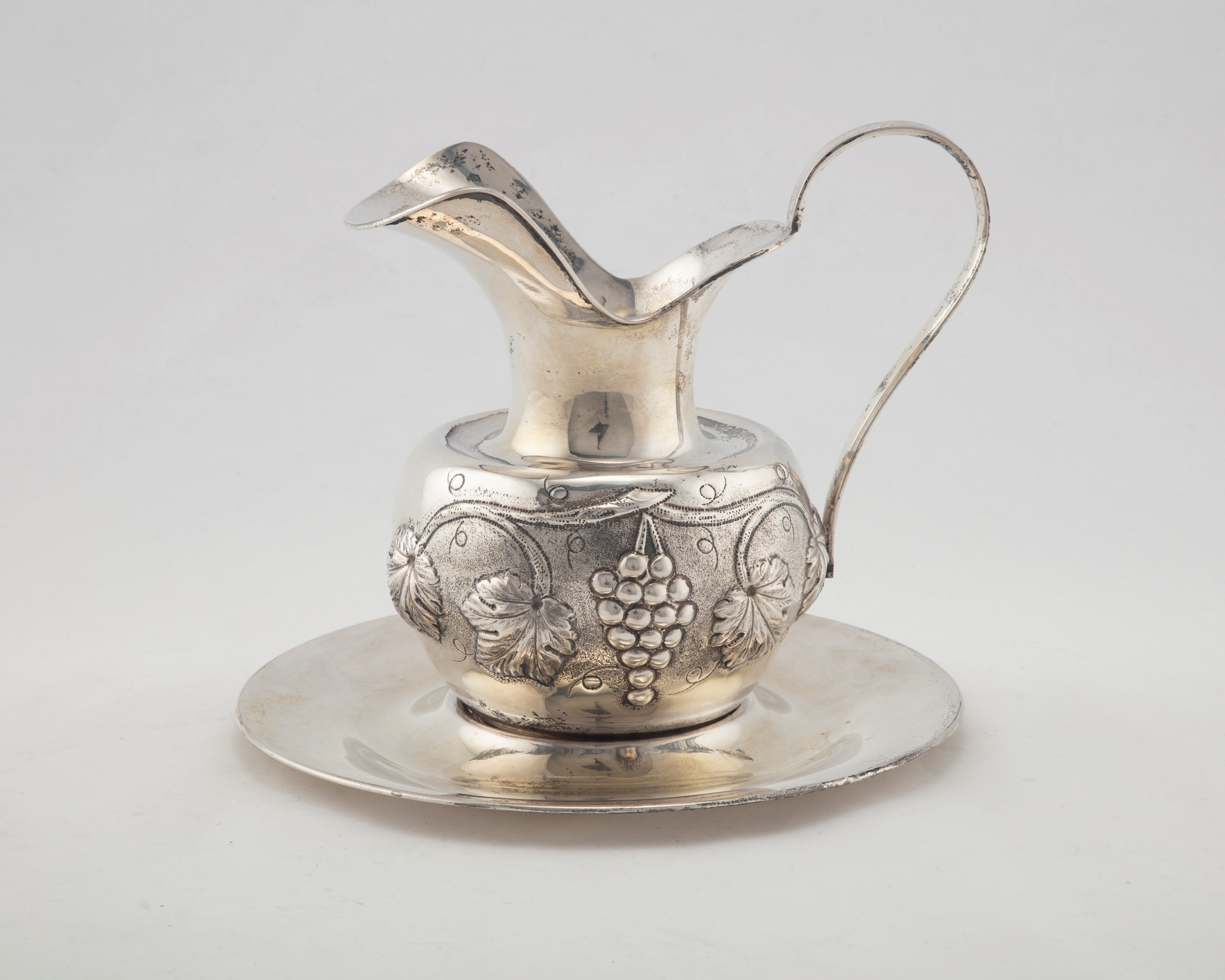 in argentola caraffa con corpo sbalzato a viticci e uva (h cm 21,00 e diametro piatto 25,50); una legumiera biansata con coperchio sbalzato a foggia di frutta (l cm 30,00x16,00); una legumiera di forma polilobata con bordo baccellato (h cm 15,00 x l 28,00).