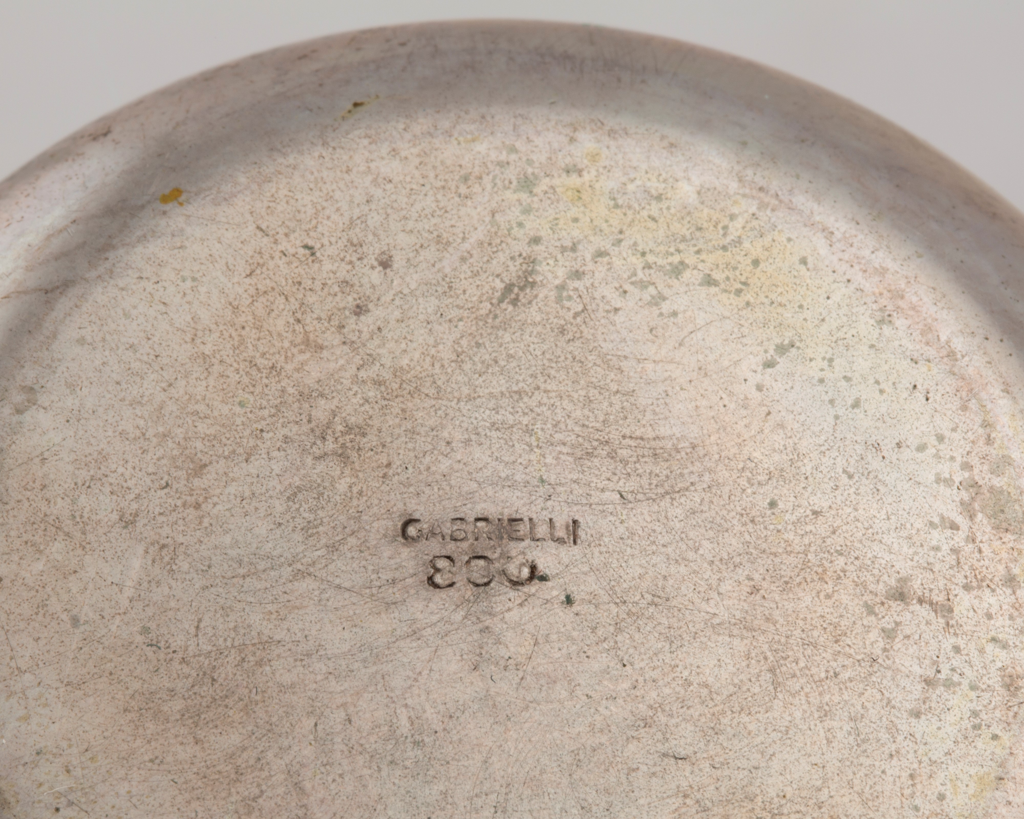 in argentocomposto da un vassoietto rettangolare, un posacenere lobato e uno circolare, tre portapillole, una scatola, due tagliacarte, una lente, un fermacarte a forma di cuore e due ciotoline.