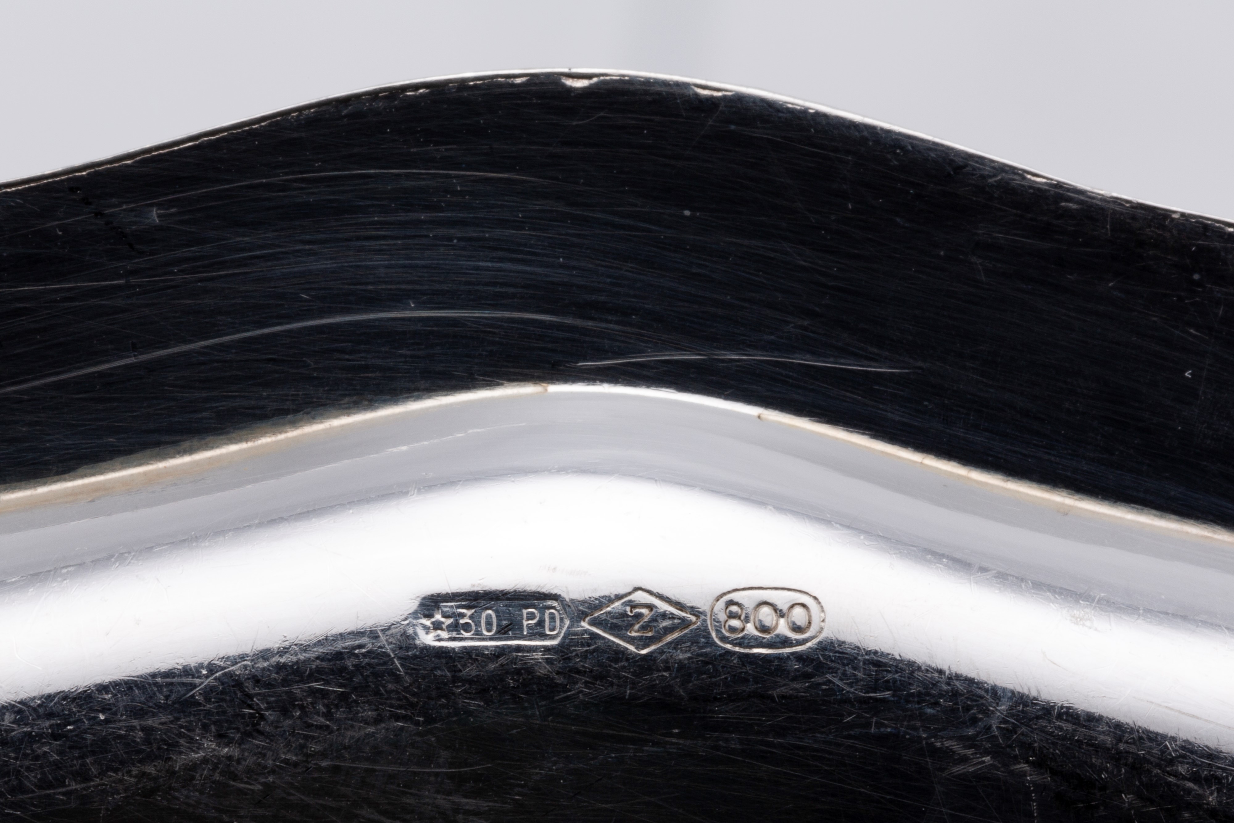 il centrotavola e due piattini a bordo mistilineo recano punzone 30 PD (F.lli Zaramella Bruno e Cesare), i due piattini pane con bordo decorato a palmette di manifattura milanese differente.
