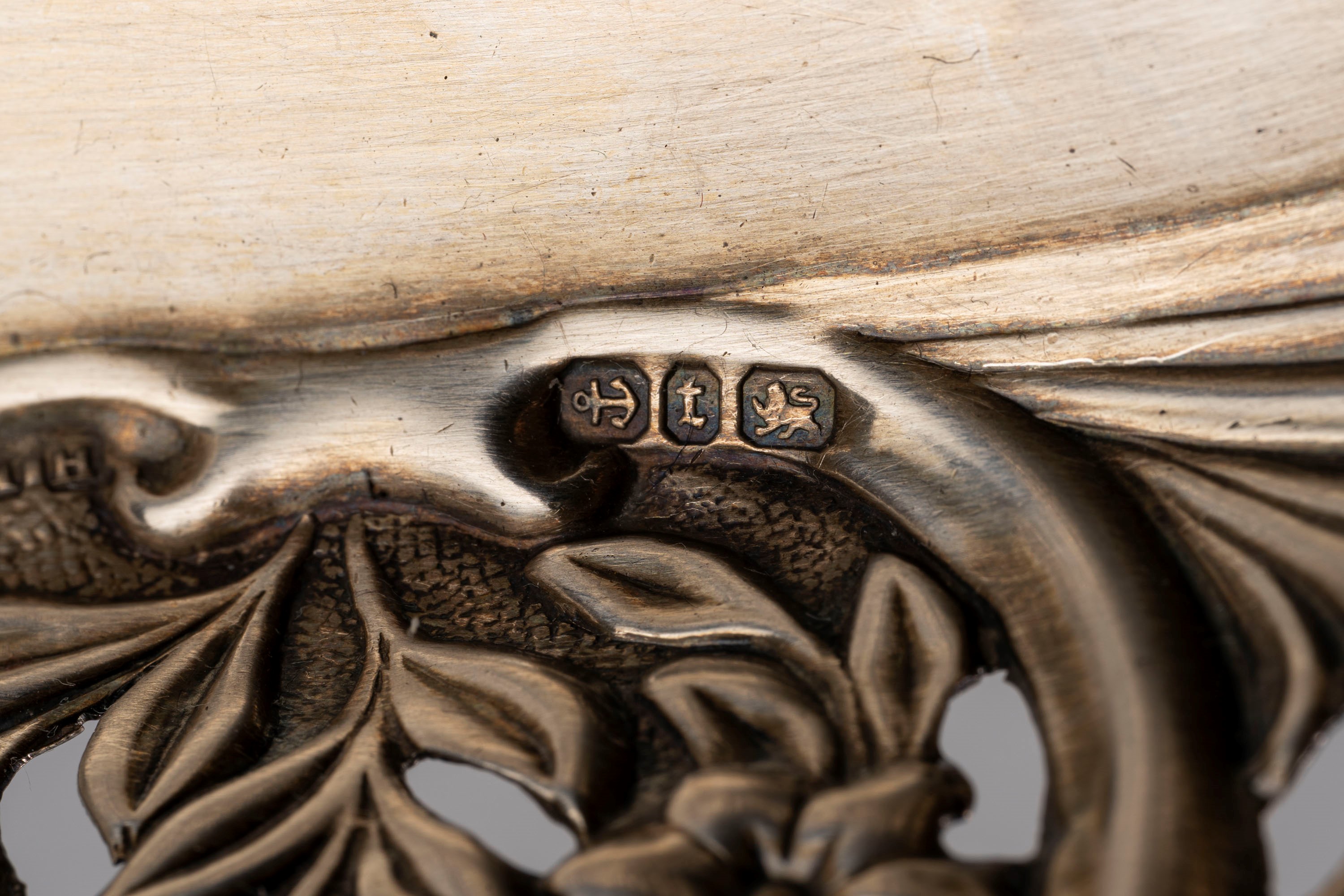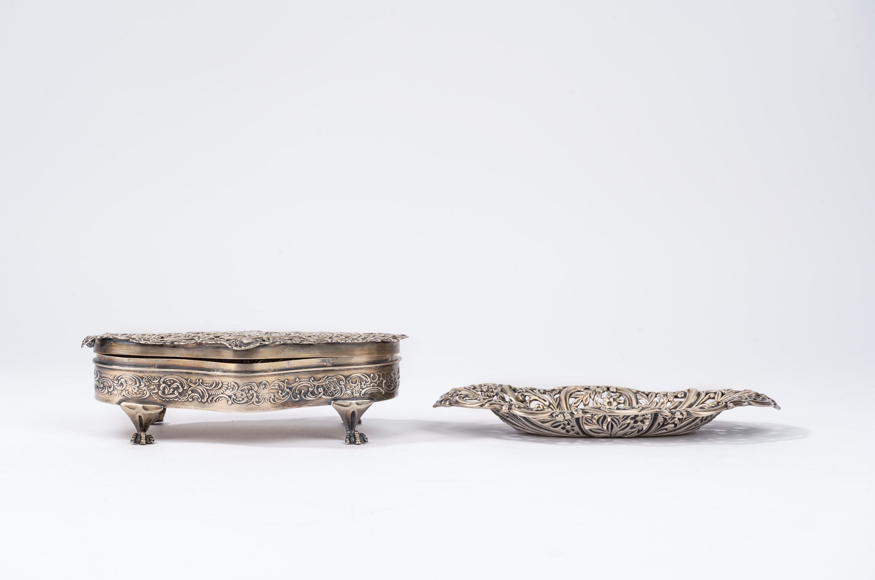 in argento 925il portagioie con coperchio traforato con scena di matrimonio e quattro piedini zoomorfi (Londra 1906), lo svuota tasche decorato a motivi floreali (Birmingham 1893).